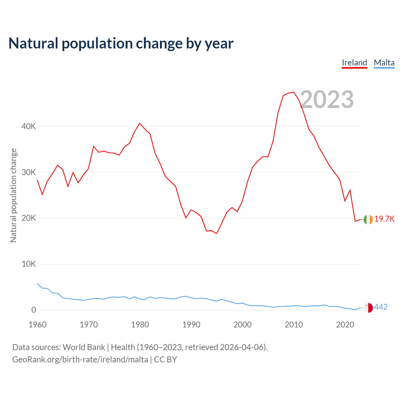 - Ireland is ranked 142/196 by birth rate compared to 174/196 for Malta.