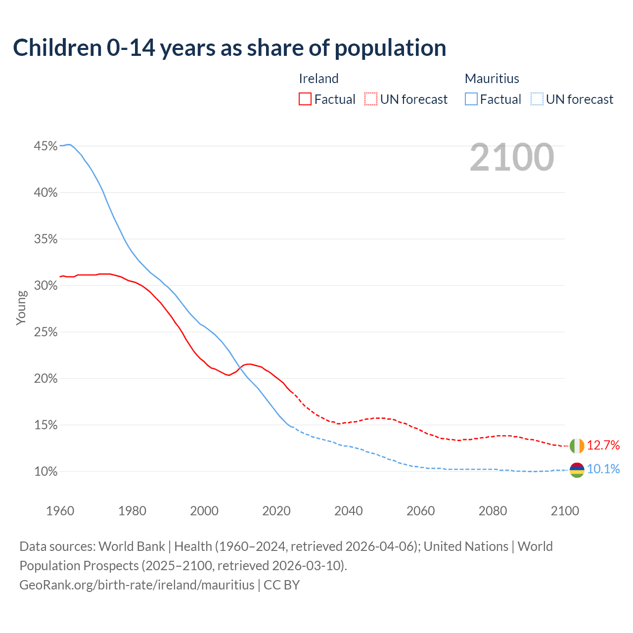 According to the latest available data on birth rates, the fertility rate in Ireland was 1.5 children per woman in 2023, compared to 1.39 in Mauritius in 2023. The replacement level is considered to be 2.1 children per woman.