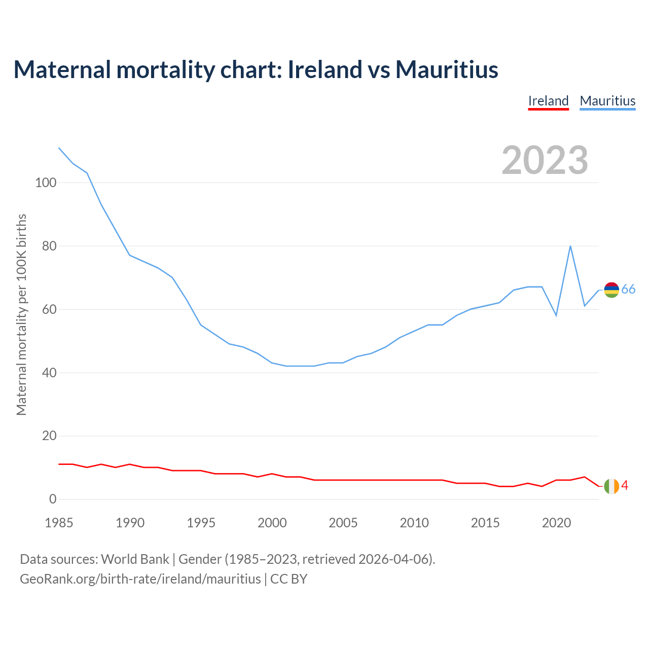The maternal mortality rate, which is the probability of dying during childbirth or within 42 days of pregnancy termination, is 4 deaths per 100,000 live births in Ireland, compared to 66 deaths in Mauritius.