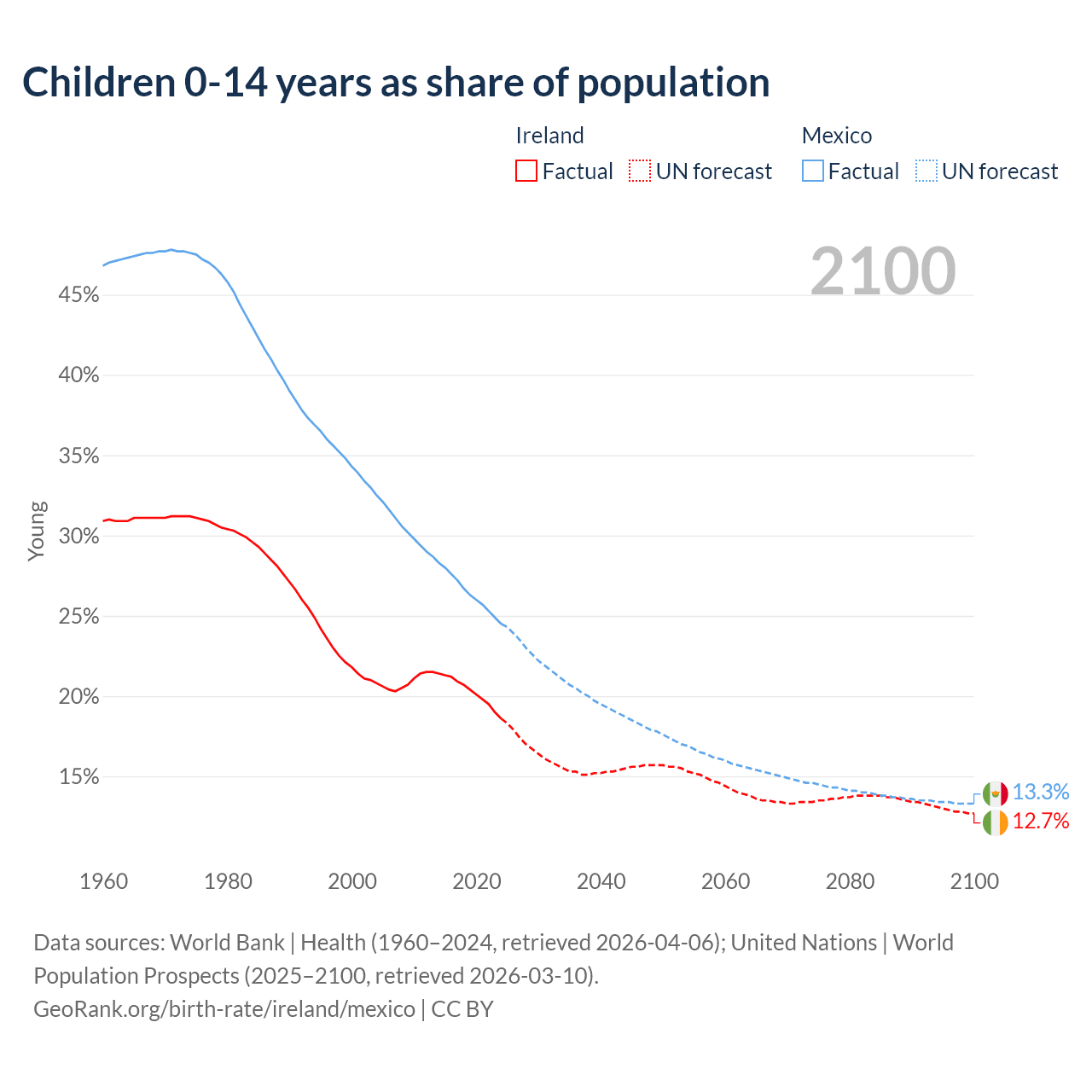 According to the latest available data on birth rates, the fertility rate in Ireland was 1.5 children per woman in 2023, compared to 1.91 in Mexico in 2023. The replacement level is considered to be 2.1 children per woman.