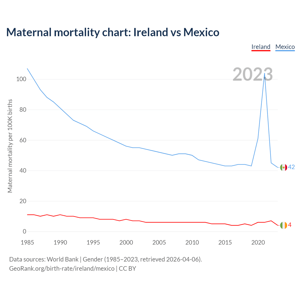 The maternal mortality rate, which is the probability of dying during childbirth or within 42 days of pregnancy termination, is 4 deaths per 100,000 live births in Ireland, compared to 42 deaths in Mexico.