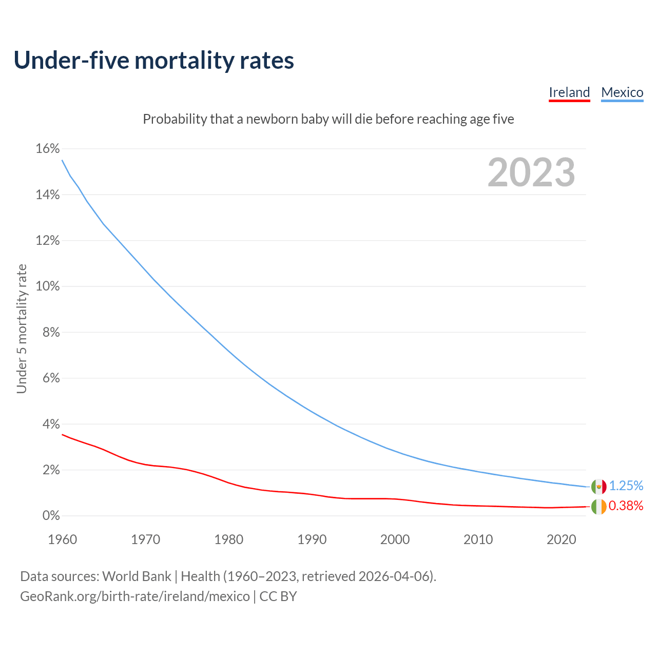 The chance that a newborn baby will die before reaching age five is 0.38% in Ireland and 1.25% in Mexico. Above is a chart with historical data on under-five mortality rates.