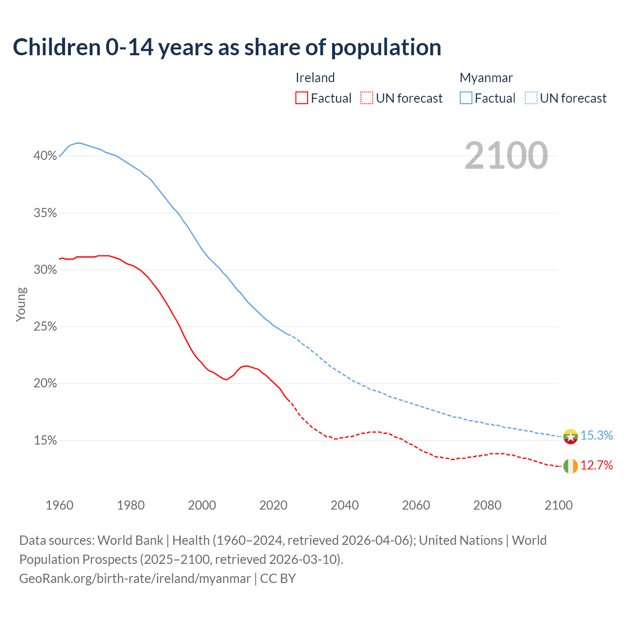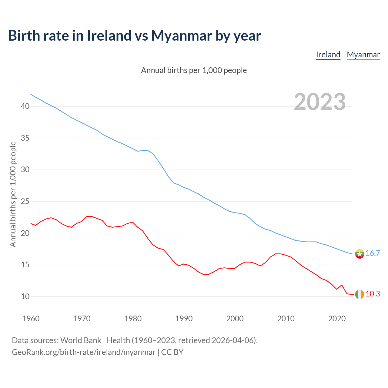 Ireland has an annual birth rate of 10.3 births per 1,000 people, compared to 16.7 for Myanmar. The average number of children a woman is expected to have during her lifetime — the fertility rate, is 1.5 in Ireland and 2.12 in Myanmar — 41% difference.