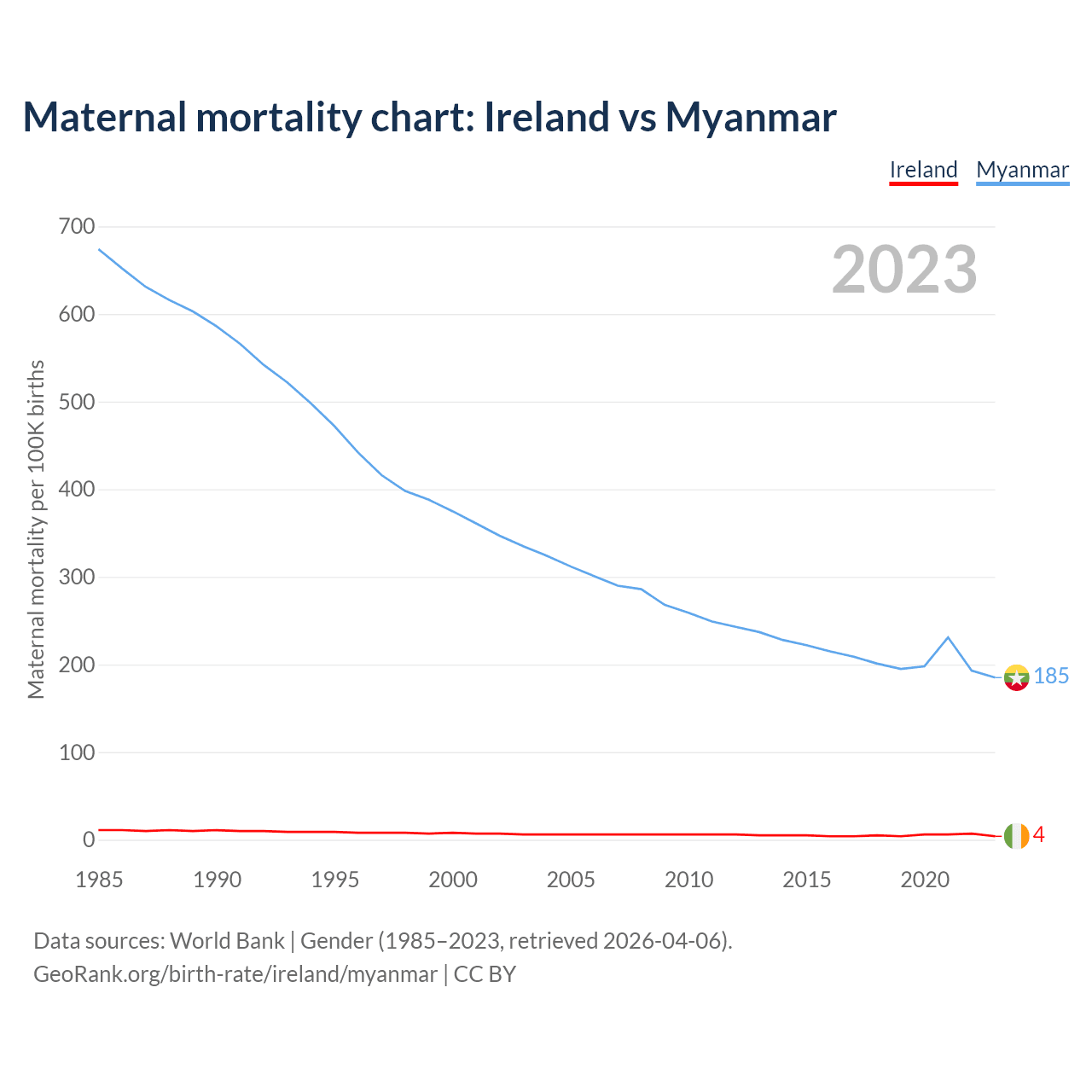 The maternal mortality rate, which is the probability of dying during childbirth or within 42 days of pregnancy termination, is 4 deaths per 100,000 live births in Ireland, compared to 185 deaths in Myanmar.