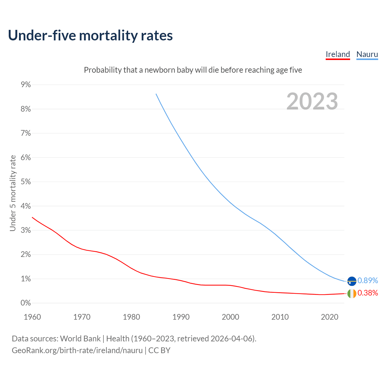 The chance that a newborn baby will die before reaching age five is 0.38% in Ireland and 0.89% in Nauru. Above is a chart with historical data on under-five mortality rates.