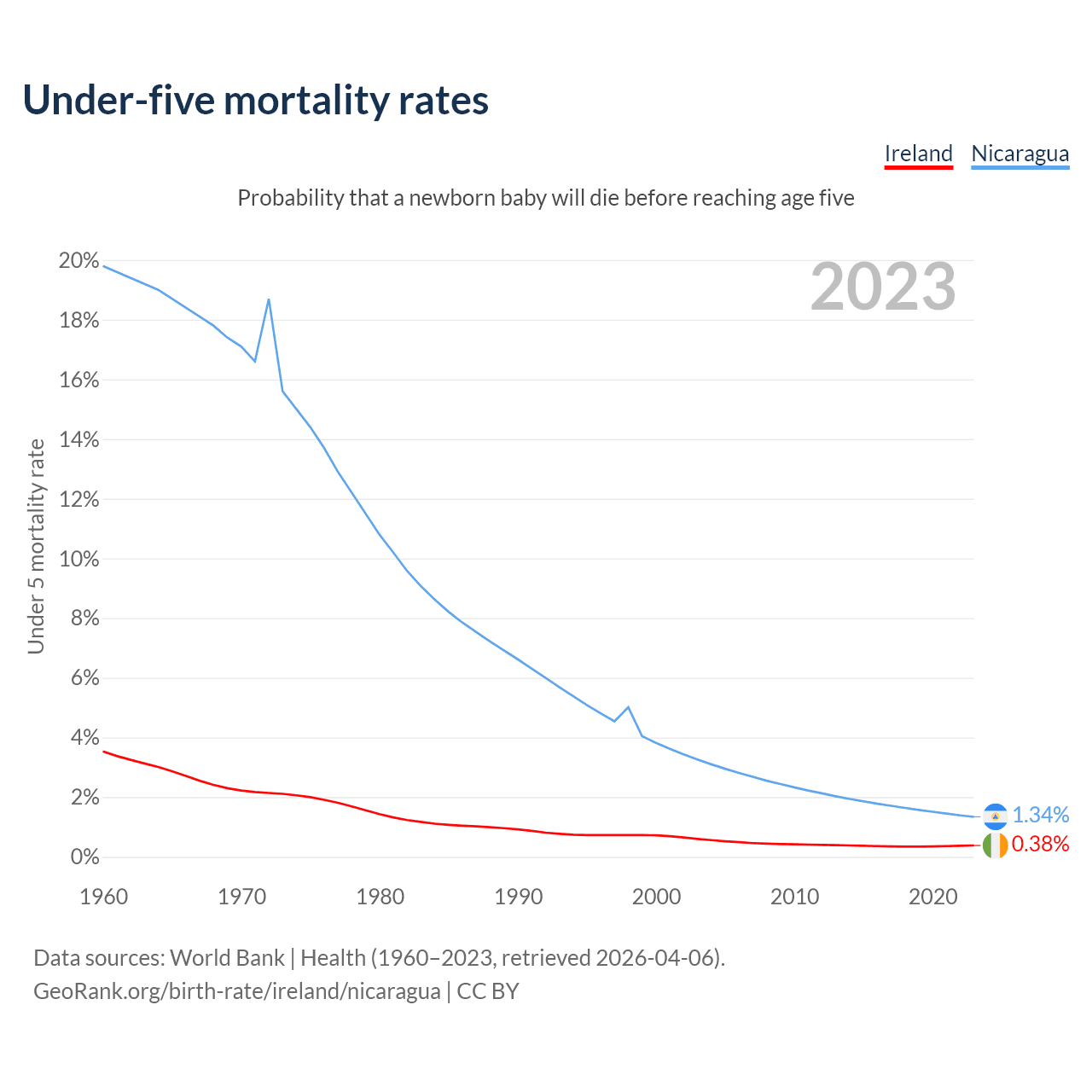The chance that a newborn baby will die before reaching age five is 0.38% in Ireland and 1.34% in Nicaragua. Above is a chart with historical data on under-five mortality rates.