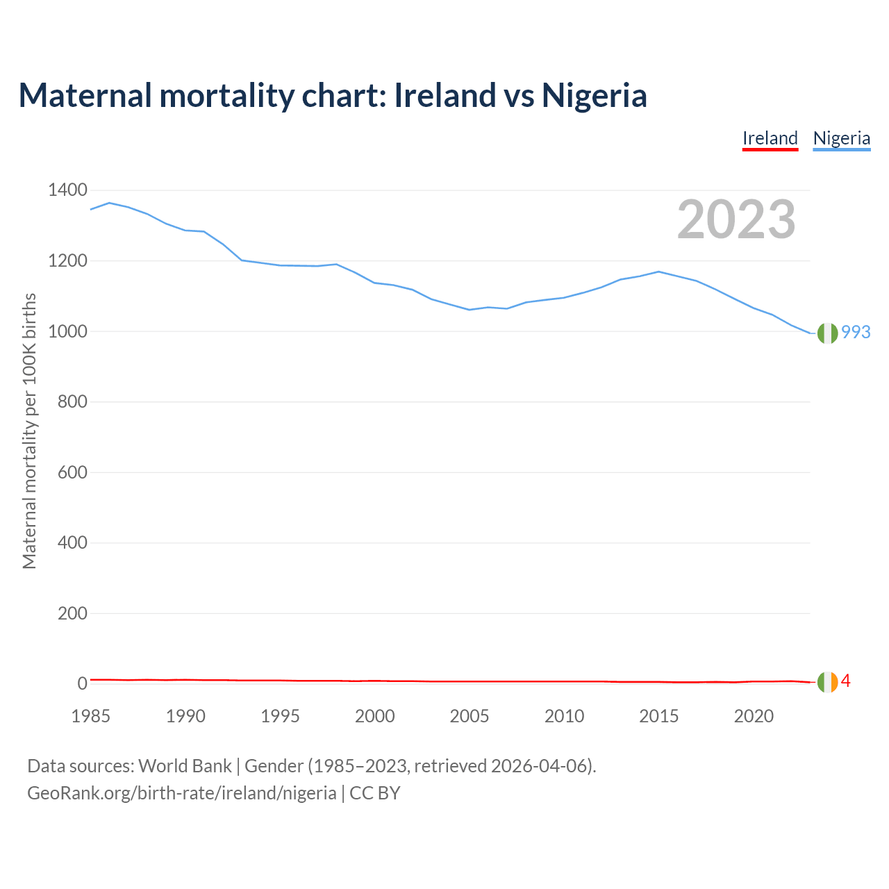 The maternal mortality rate, which is the probability of dying during childbirth or within 42 days of pregnancy termination, is 4 deaths per 100,000 live births in Ireland, compared to 993 deaths in Nigeria.