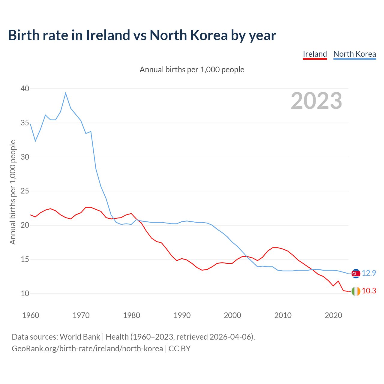 Ireland has an annual birth rate of 10.3 births per 1,000 people, compared to 12.9 for North Korea. The average number of children a woman is expected to have during her lifetime — the fertility rate, is 1.5 in Ireland and 1.78 in North Korea — 18.7% difference.