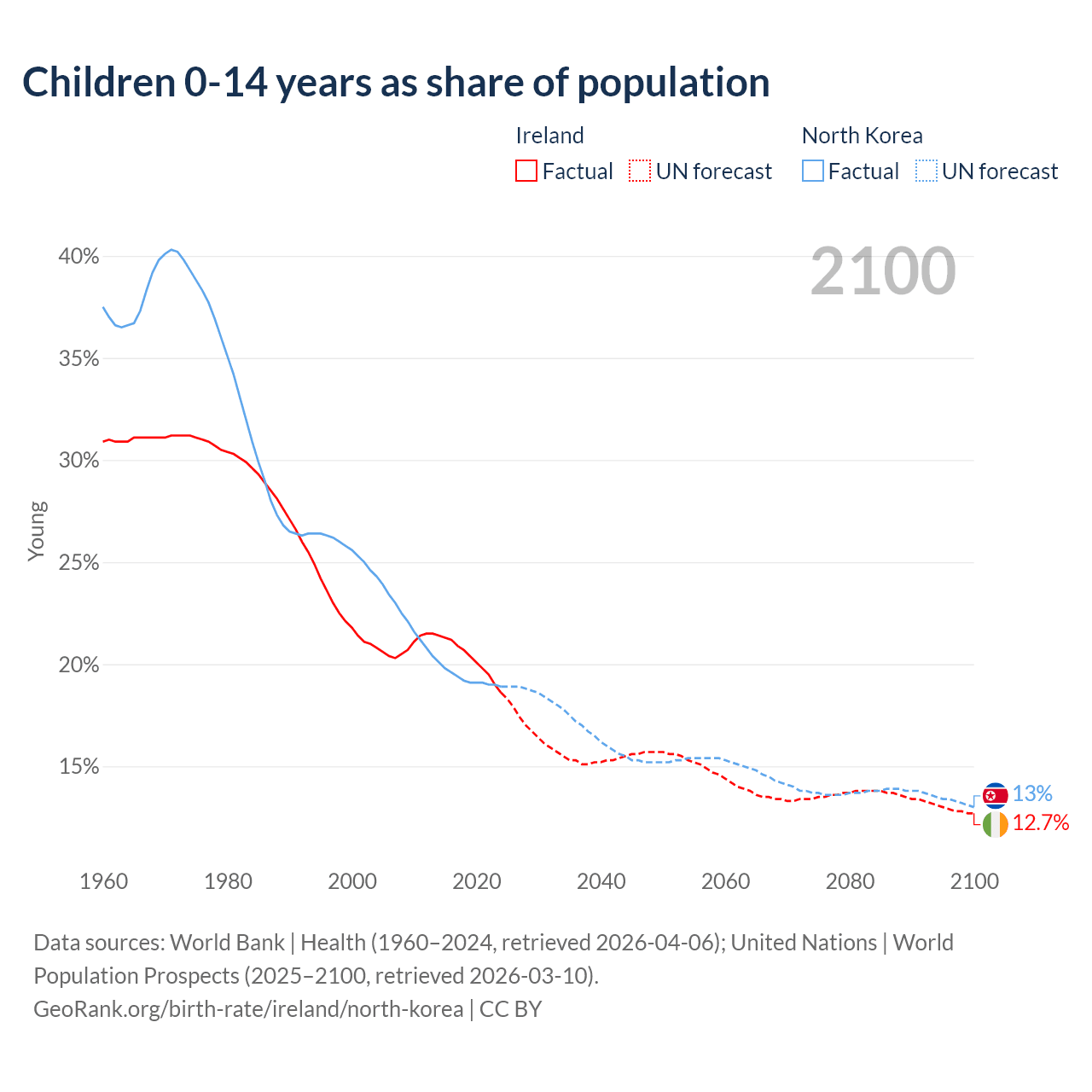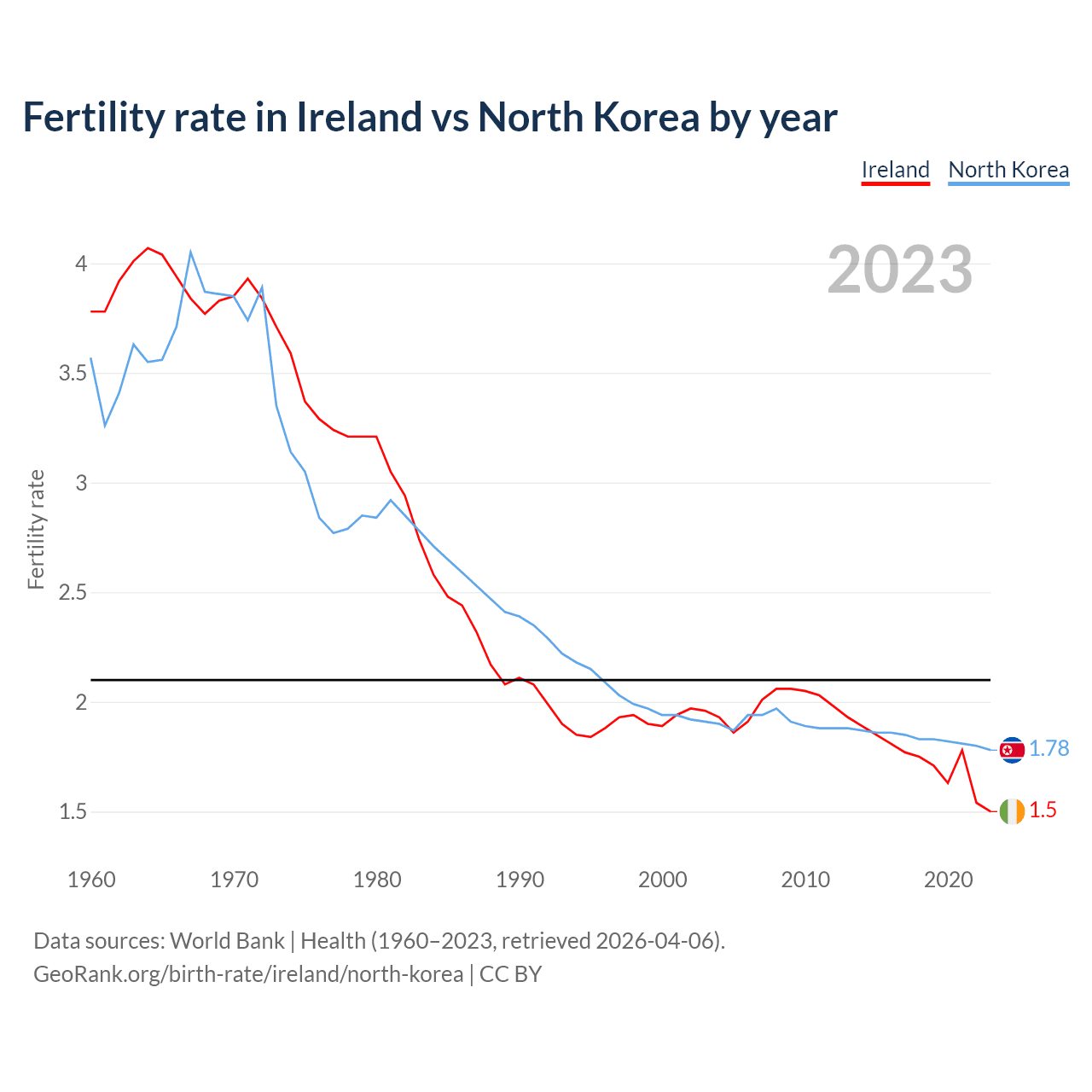 According to the latest available data on birth rates, the fertility rate in Ireland was 1.5 children per woman in 2023, compared to 1.78 in North Korea in 2023. The replacement level is considered to be 2.1 children per woman.