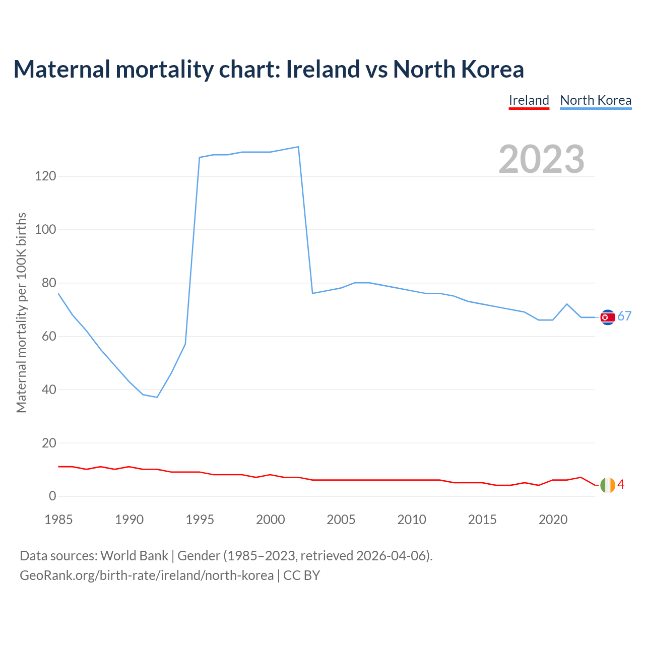 The maternal mortality rate, which is the probability of dying during childbirth or within 42 days of pregnancy termination, is 4 deaths per 100,000 live births in Ireland, compared to 67 deaths in North Korea.