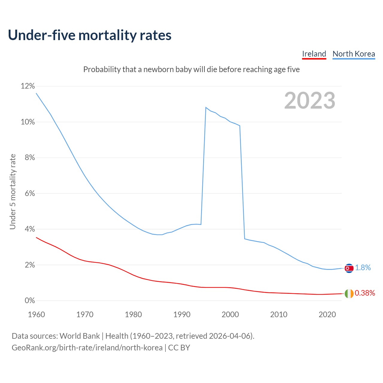 The chance that a newborn baby will die before reaching age five is 0.38% in Ireland and 1.8% in North Korea. Above is a chart with historical data on under-five mortality rates.