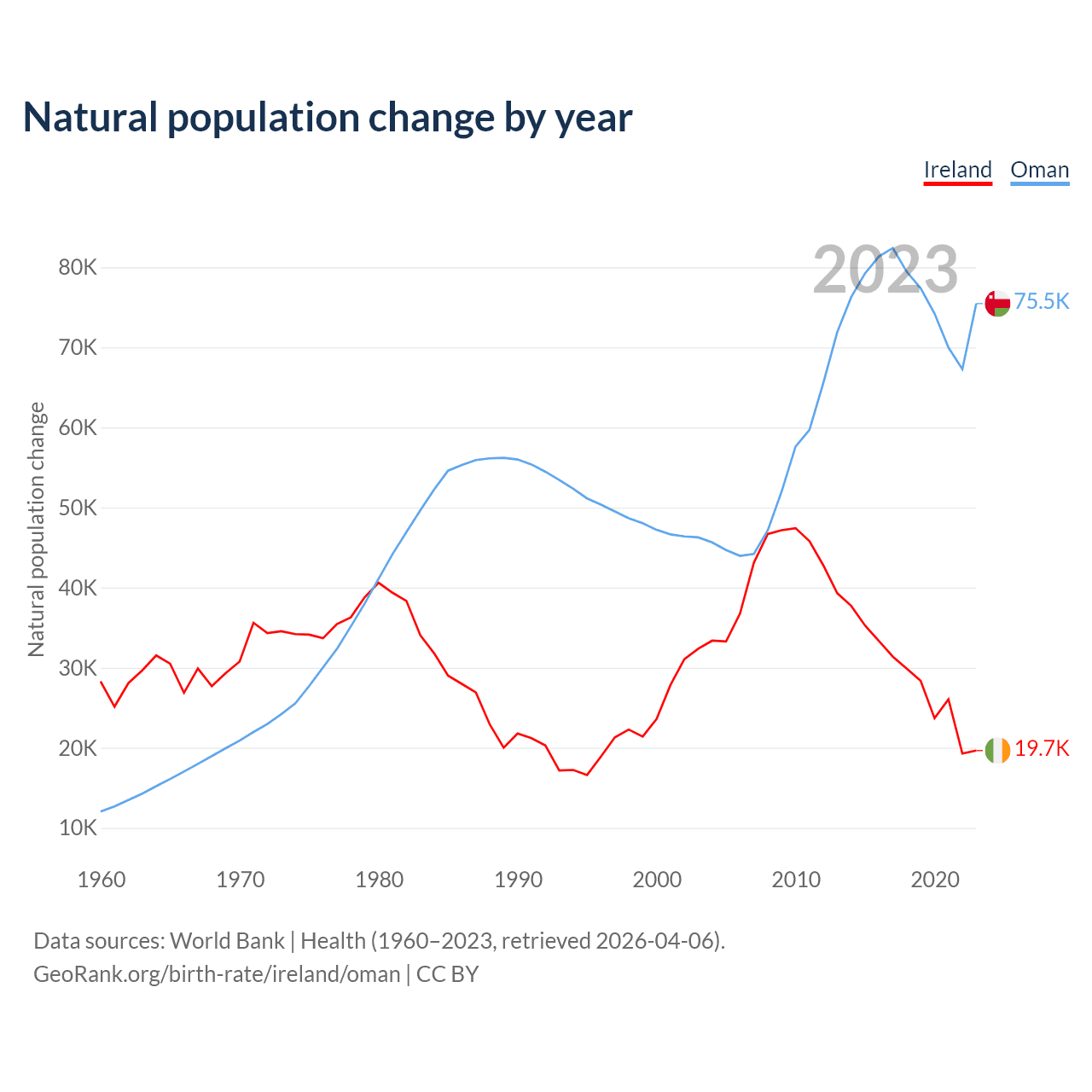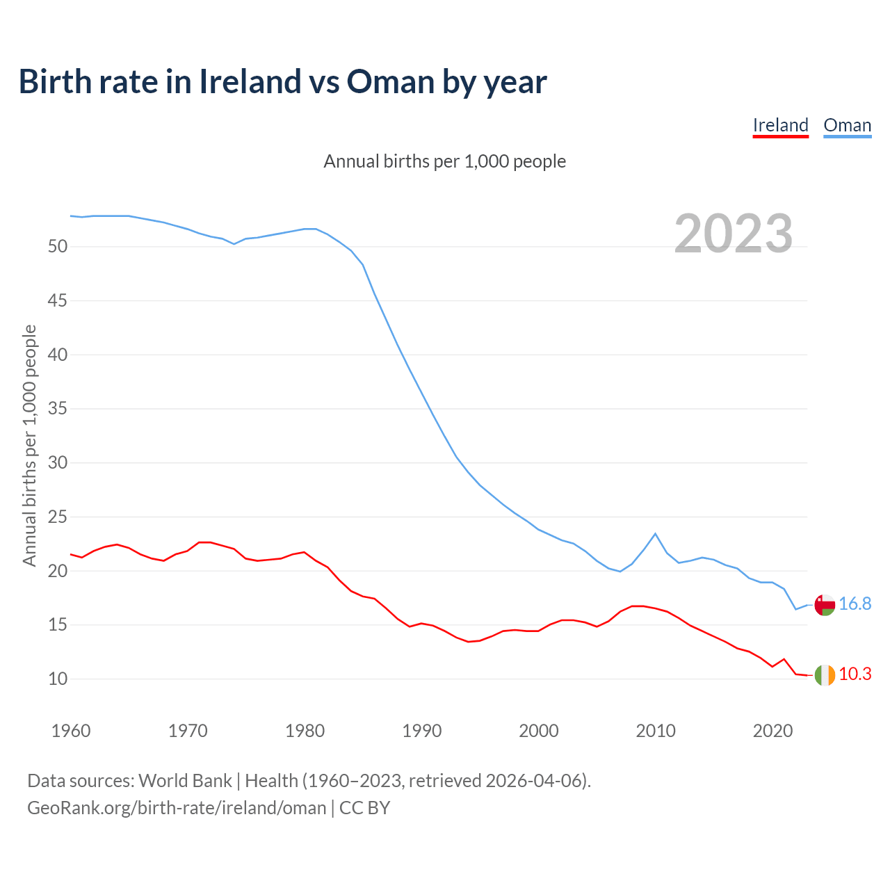 Ireland has an annual birth rate of 10.3 births per 1,000 people, compared to 16.8 for Oman. The average number of children a woman is expected to have during her lifetime — the fertility rate, is 1.5 in Ireland and 2.53 in Oman — 68.3% difference.