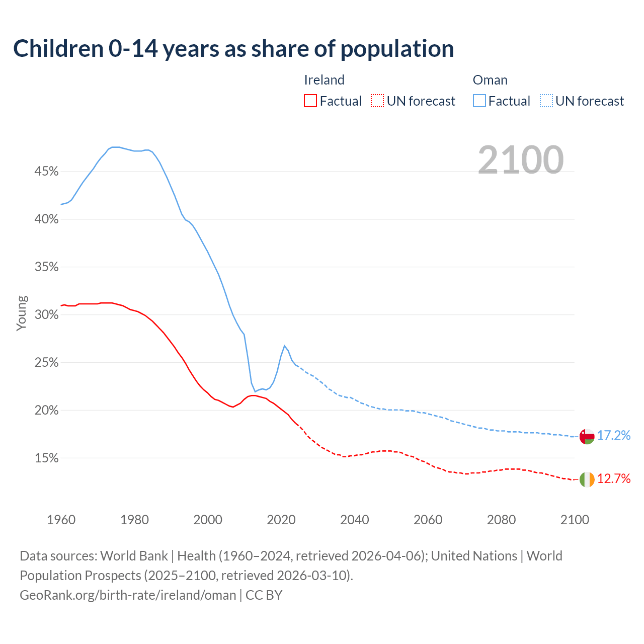 According to the latest available data on birth rates, the fertility rate in Ireland was 1.5 children per woman in 2023, compared to 2.53 in Oman in 2023. The replacement level is considered to be 2.1 children per woman.