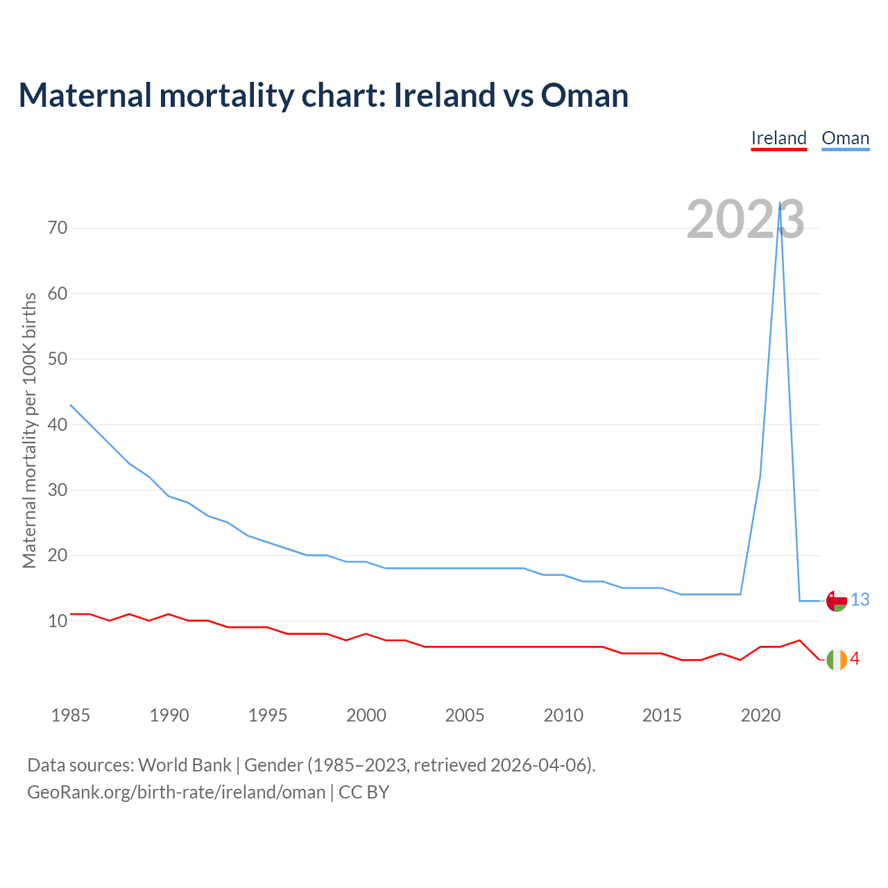 The maternal mortality rate, which is the probability of dying during childbirth or within 42 days of pregnancy termination, is 4 deaths per 100,000 live births in Ireland, compared to 13 deaths in Oman.