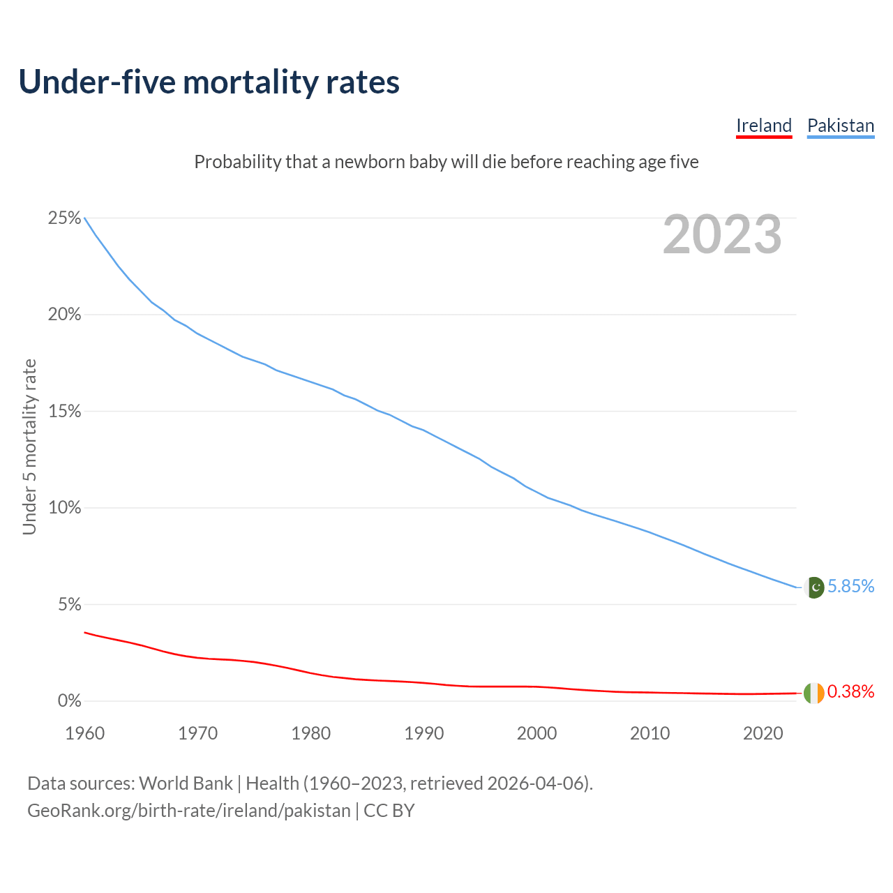 The chance that a newborn baby will die before reaching age five is 0.38% in Ireland and 5.85% in Pakistan. Above is a chart with historical data on under-five mortality rates.