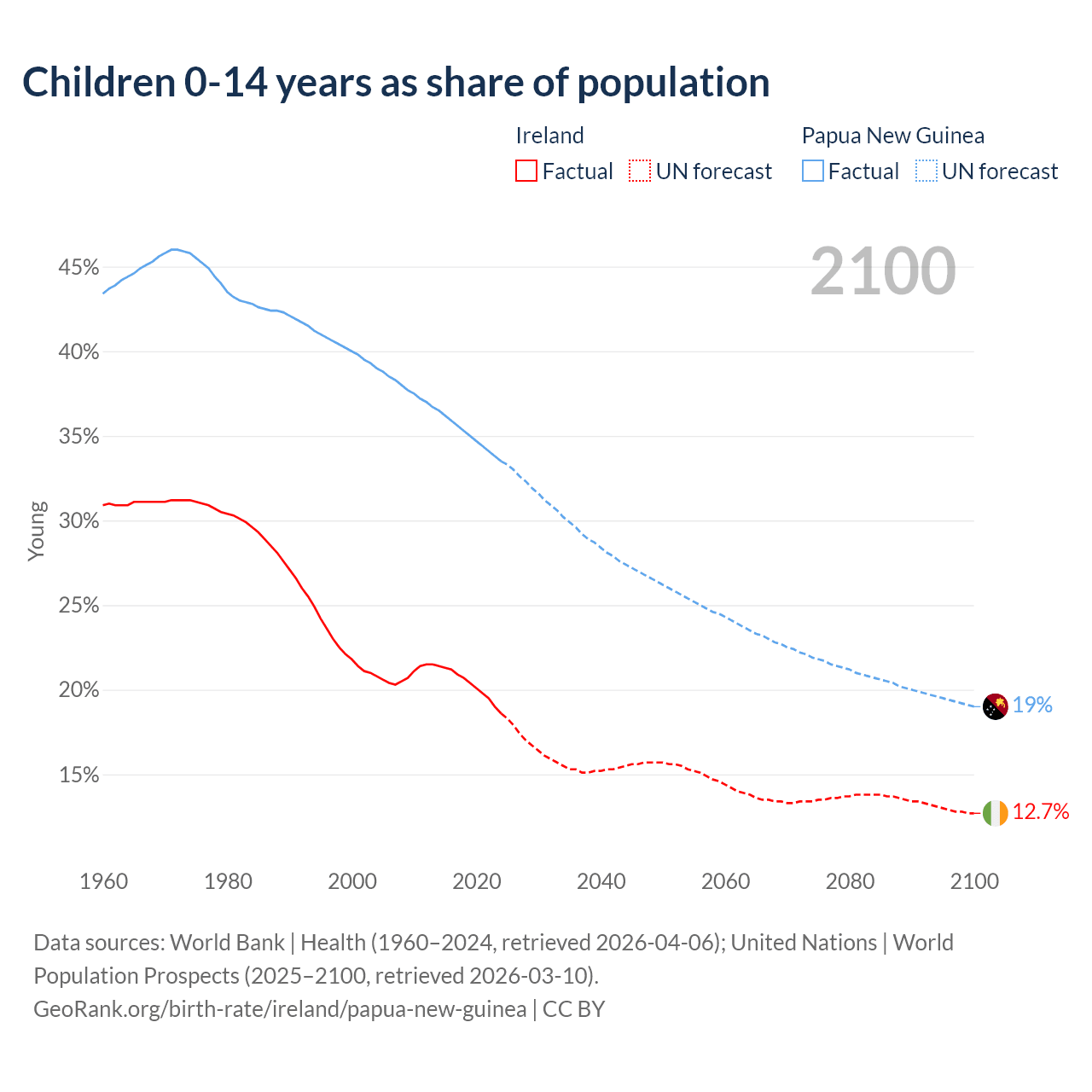 Ireland has an annual birth rate of 10.3 births per 1,000 people, compared to 24.6 for Papua New Guinea. The average number of children a woman is expected to have during her lifetime — the fertility rate, is 1.5 in Ireland and 3.1 in Papua New Guinea — 106.6% difference.