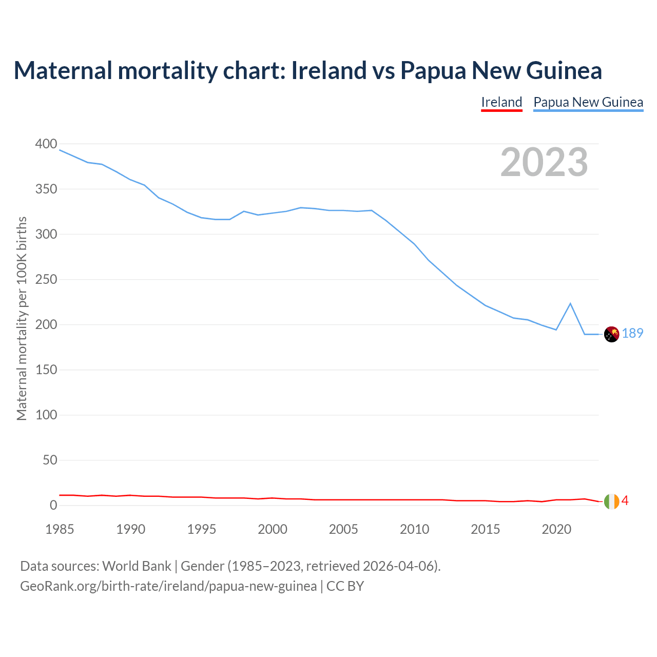 The maternal mortality rate, which is the probability of dying during childbirth or within 42 days of pregnancy termination, is 4 deaths per 100,000 live births in Ireland, compared to 189 deaths in Papua New Guinea.