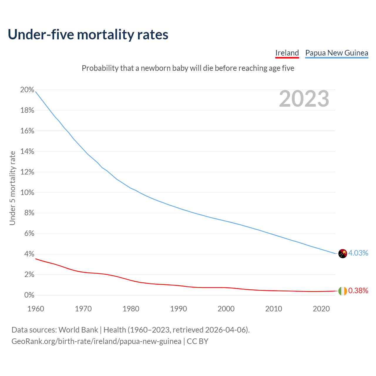 The chance that a newborn baby will die before reaching age five is 0.38% in Ireland and 4.03% in Papua New Guinea. Above is a chart with historical data on under-five mortality rates.
