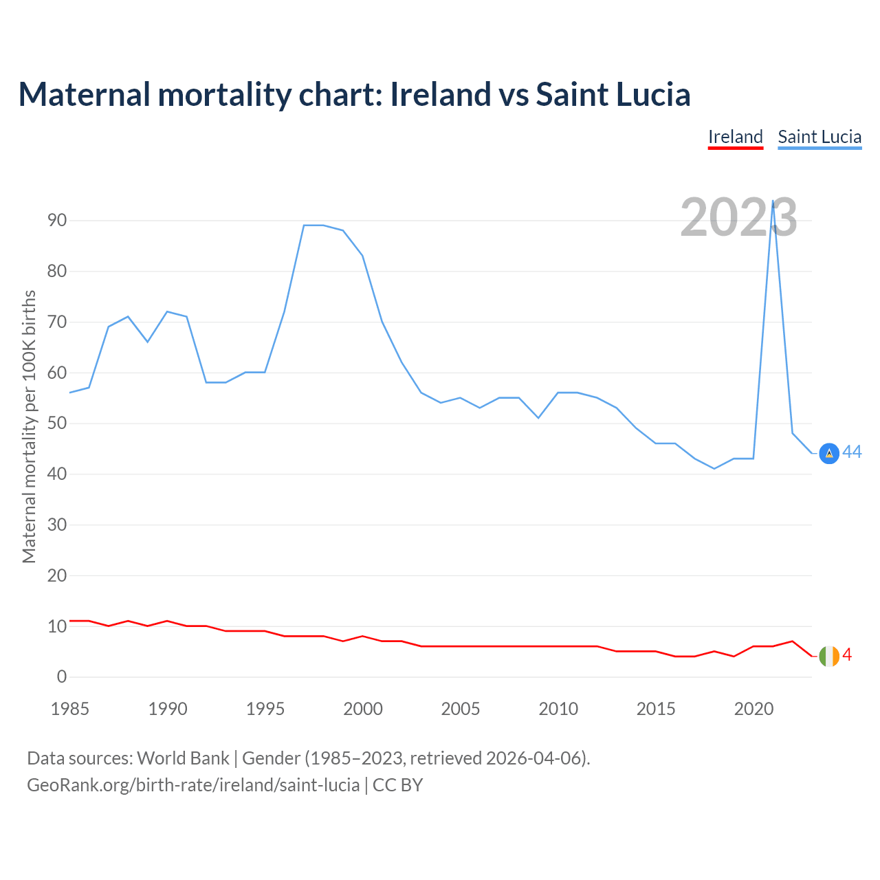 The maternal mortality rate, which is the probability of dying during childbirth or within 42 days of pregnancy termination, is 4 deaths per 100,000 live births in Ireland, compared to 44 deaths in Saint Lucia.