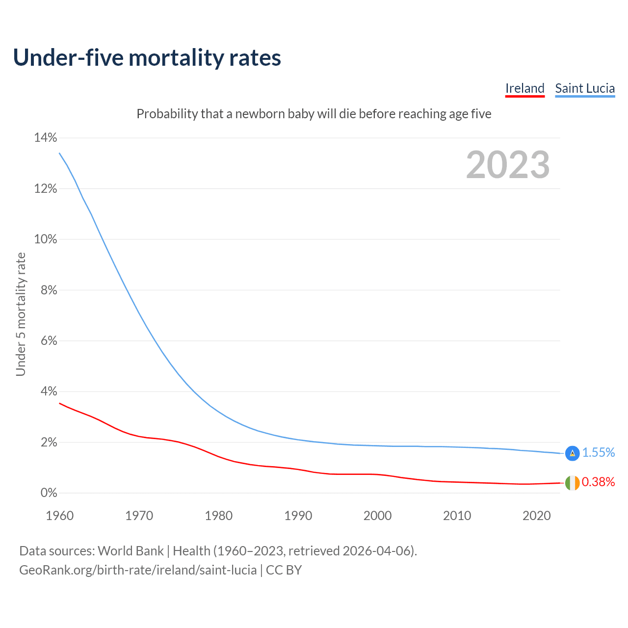 The chance that a newborn baby will die before reaching age five is 0.38% in Ireland and 1.55% in Saint Lucia. Above is a chart with historical data on under-five mortality rates.