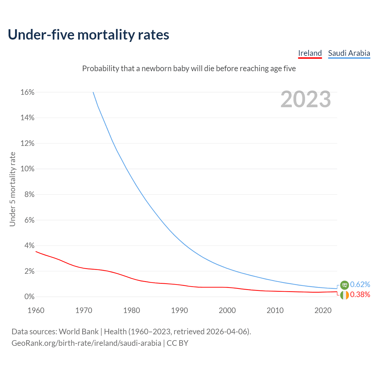 The chance that a newborn baby will die before reaching age five is 0.38% in Ireland and 0.62% in Saudi Arabia. Above is a chart with historical data on under-five mortality rates.