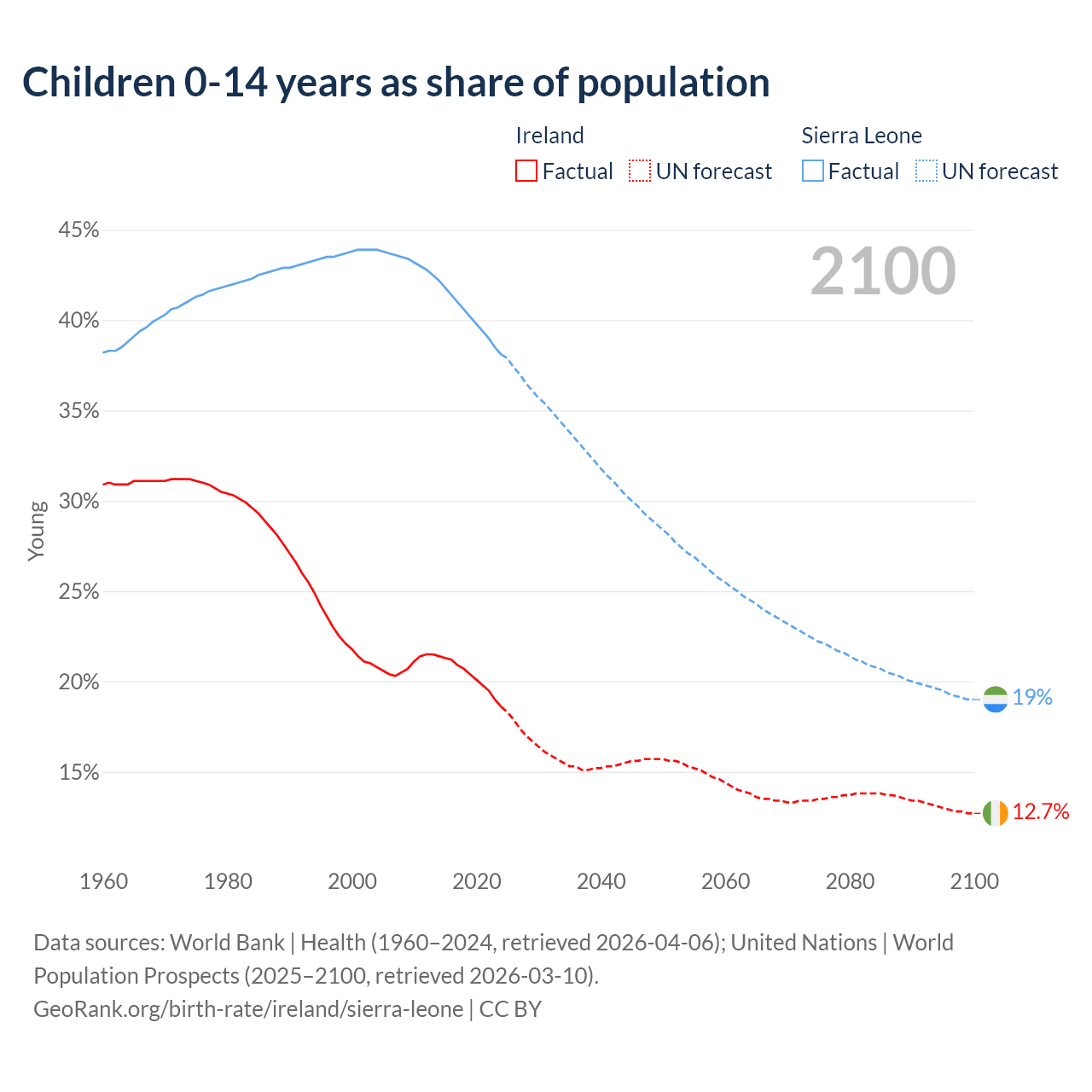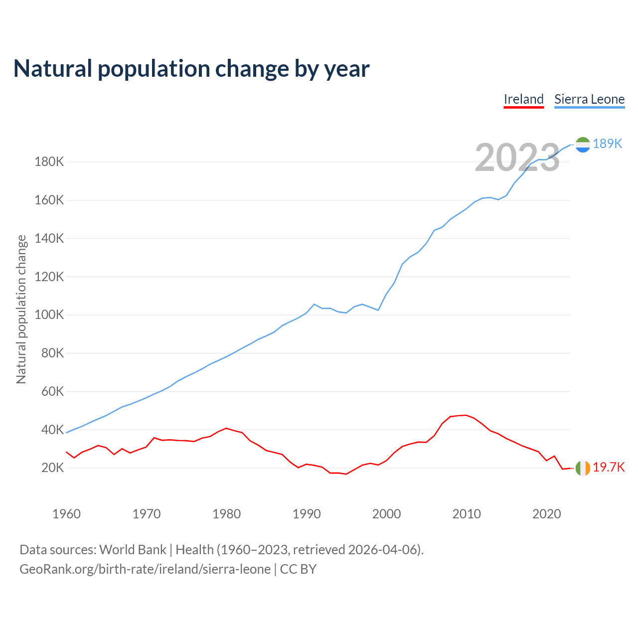 Ireland has an annual birth rate of 10.3 births per 1,000 people, compared to 30.6 for Sierra Leone. The average number of children a woman is expected to have during her lifetime — the fertility rate, is 1.5 in Ireland and 3.79 in Sierra Leone — 152.7% difference.