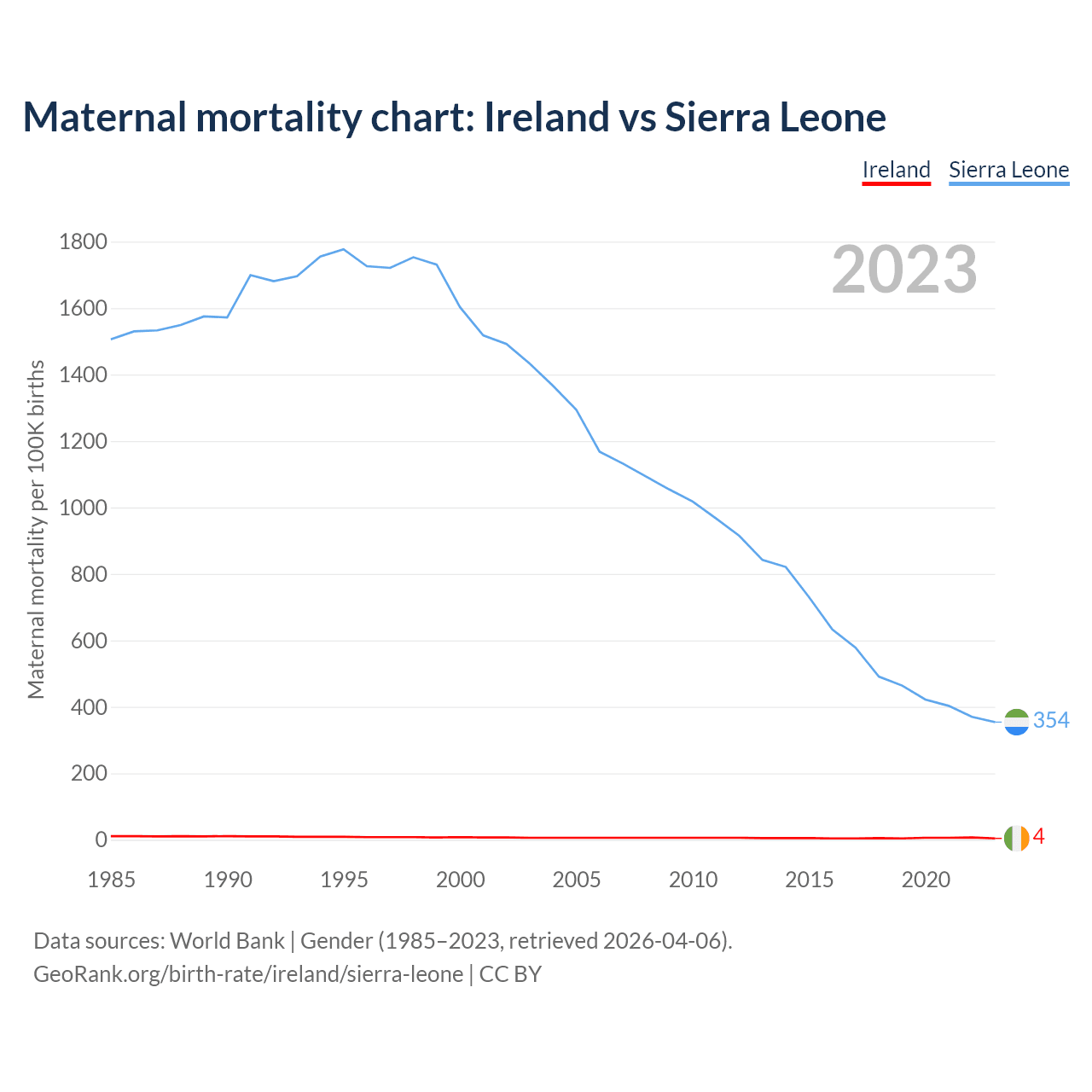 The maternal mortality rate, which is the probability of dying during childbirth or within 42 days of pregnancy termination, is 4 deaths per 100,000 live births in Ireland, compared to 354 deaths in Sierra Leone.