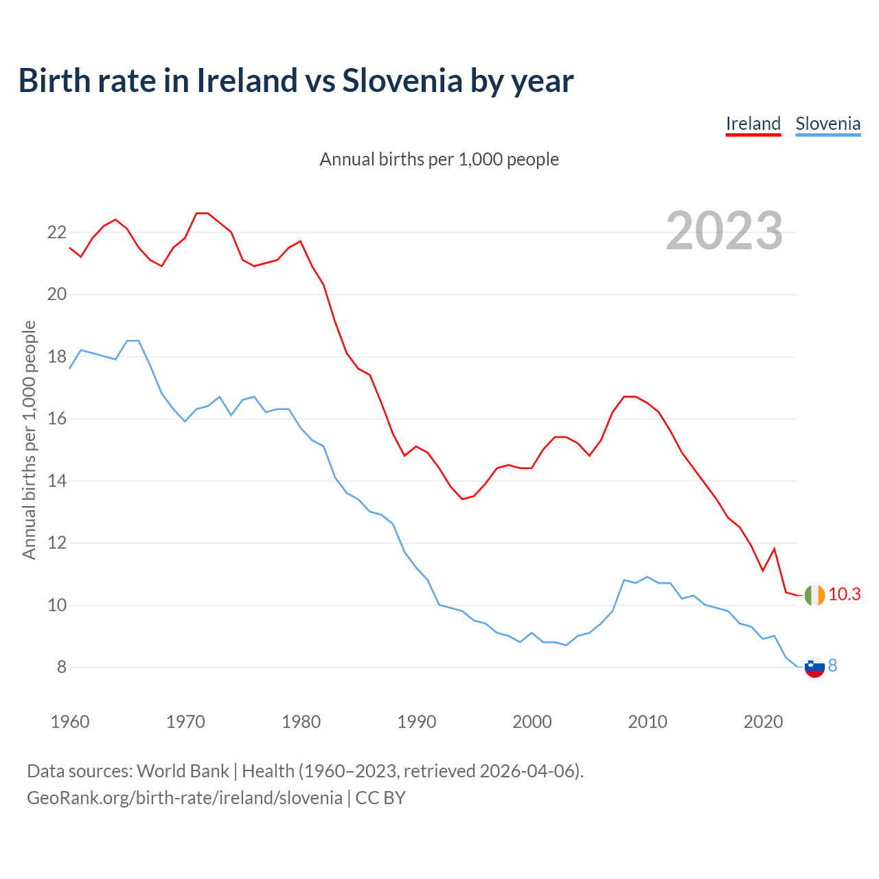 Ireland has an annual birth rate of 10.3 births per 1,000 people, compared to 8 for Slovenia. The average number of children a woman is expected to have during her lifetime — the fertility rate, is 1.5 in Ireland and 1.51 in Slovenia — 0.67% difference.