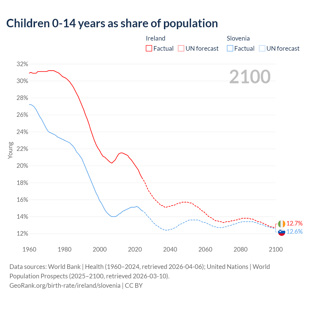 According to the latest available data on birth rates, the fertility rate in Ireland was 1.5 children per woman in 2023, compared to 1.51 in Slovenia in 2023. The replacement level is considered to be 2.1 children per woman.