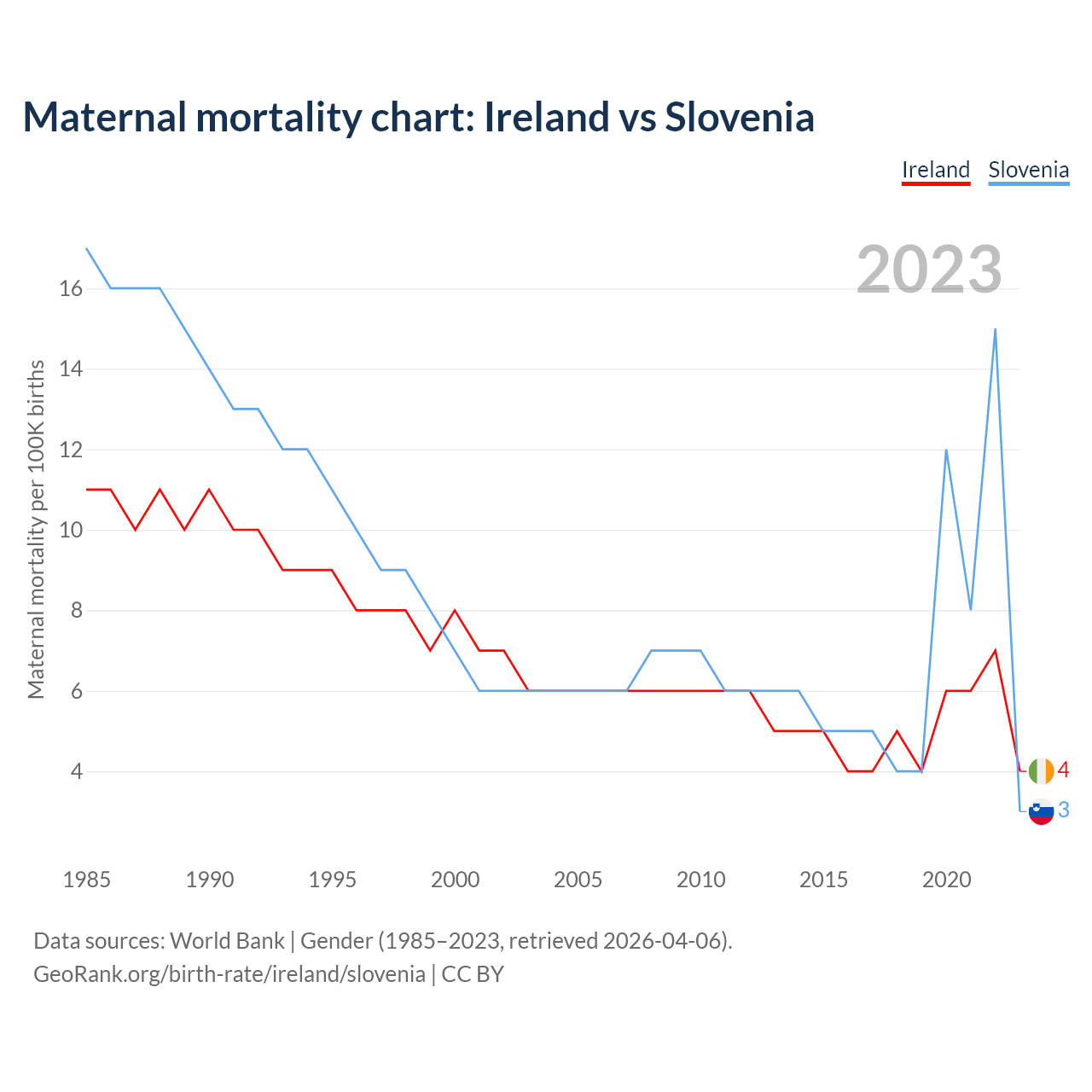 The maternal mortality rate, which is the probability of dying during childbirth or within 42 days of pregnancy termination, is 4 deaths per 100,000 live births in Ireland, compared to 3 deaths in Slovenia.
