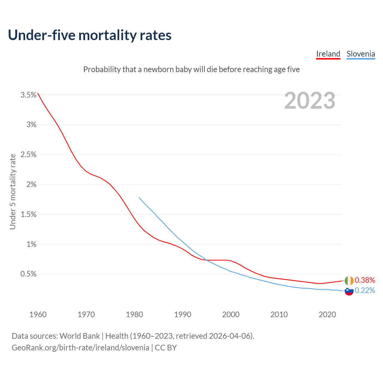 The chance that a newborn baby will die before reaching age five is 0.38% in Ireland and 0.22% in Slovenia. Above is a chart with historical data on under-five mortality rates.