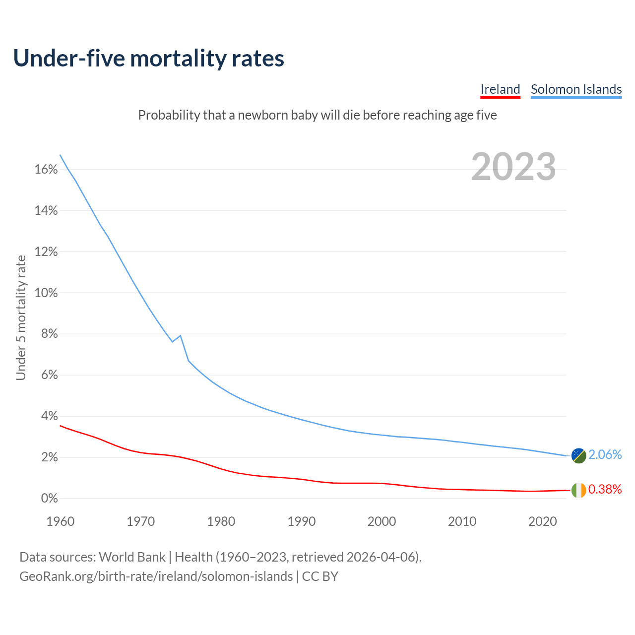 The chance that a newborn baby will die before reaching age five is 0.38% in Ireland and 2.06% in the Solomon Islands. Above is a chart with historical data on under-five mortality rates.