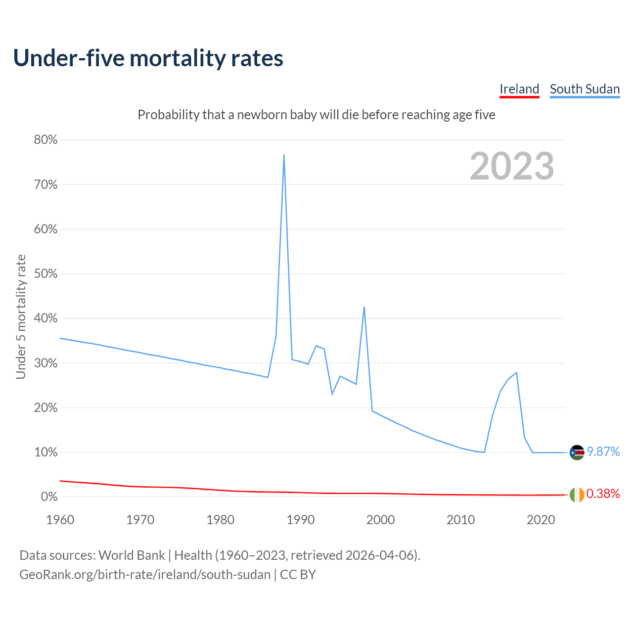 The chance that a newborn baby will die before reaching age five is 0.38% in Ireland and 9.87% in South Sudan. Above is a chart with historical data on under-five mortality rates.