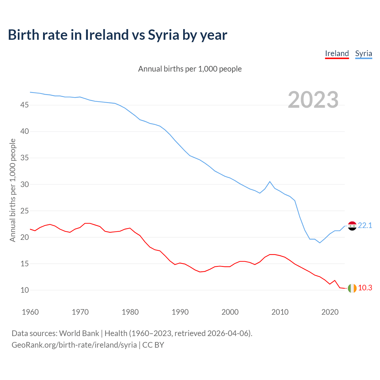 According to the latest available data on birth rates, the fertility rate in Ireland was 1.5 children per woman in 2023, compared to 2.71 in Syria in 2023. The replacement level is considered to be 2.1 children per woman.