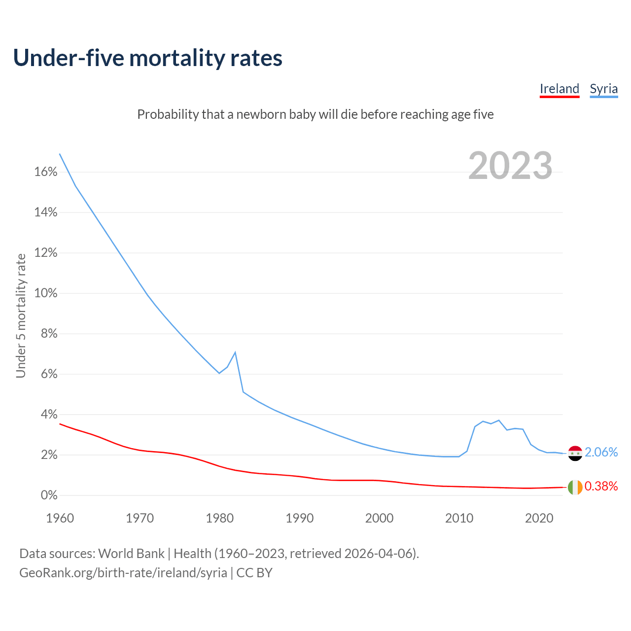 The chance that a newborn baby will die before reaching age five is 0.38% in Ireland and 2.06% in Syria. Above is a chart with historical data on under-five mortality rates.
