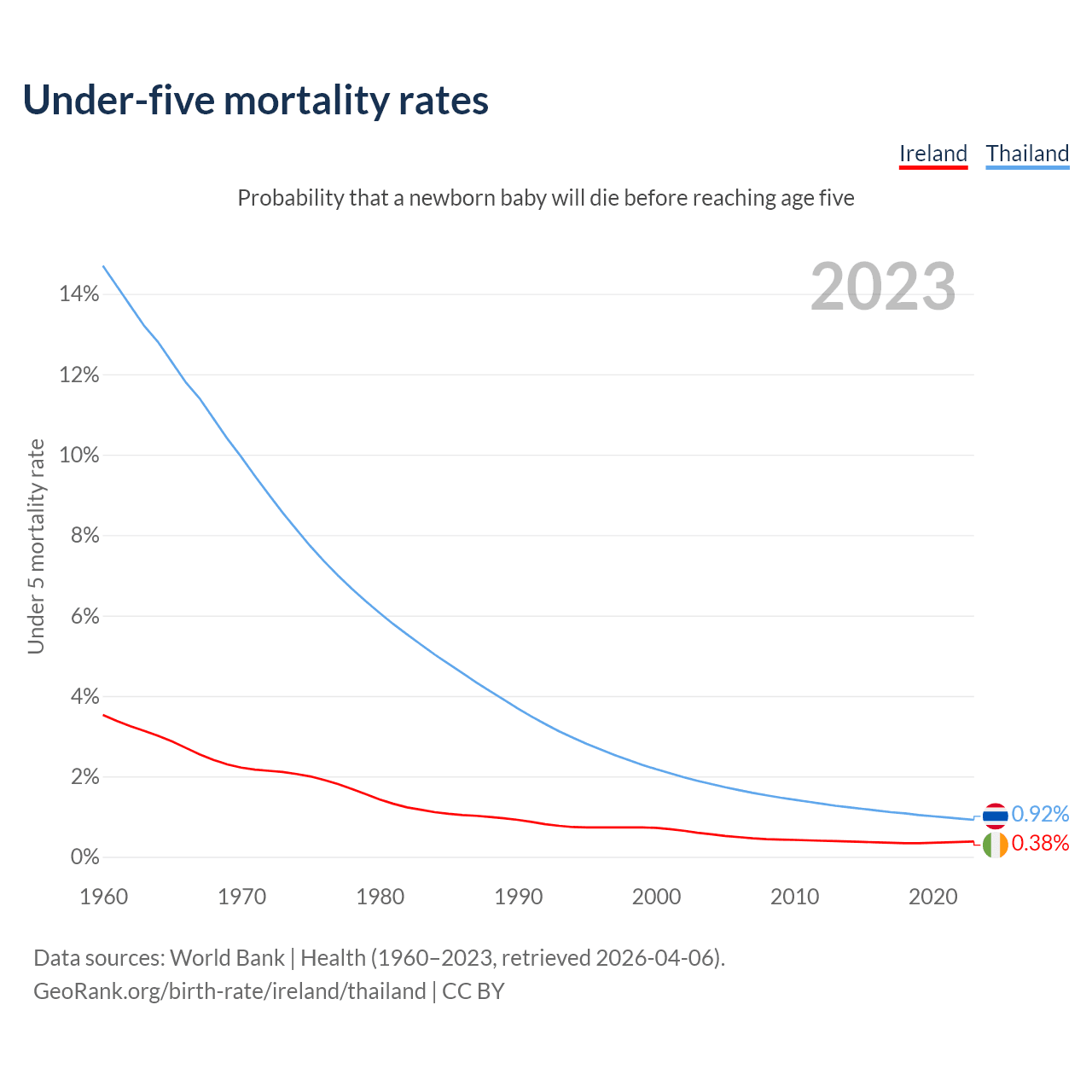 The chance that a newborn baby will die before reaching age five is 0.38% in Ireland and 0.92% in Thailand. Above is a chart with historical data on under-five mortality rates.