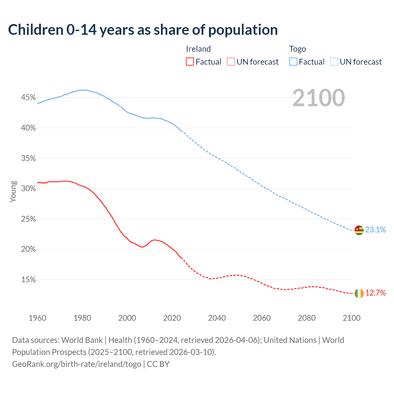 Ireland has an annual birth rate of 10.3 births per 1,000 people, compared to 31.1 for Togo. The average number of children a woman is expected to have during her lifetime — the fertility rate, is 1.5 in Ireland and 4.19 in Togo — 179.5% difference.