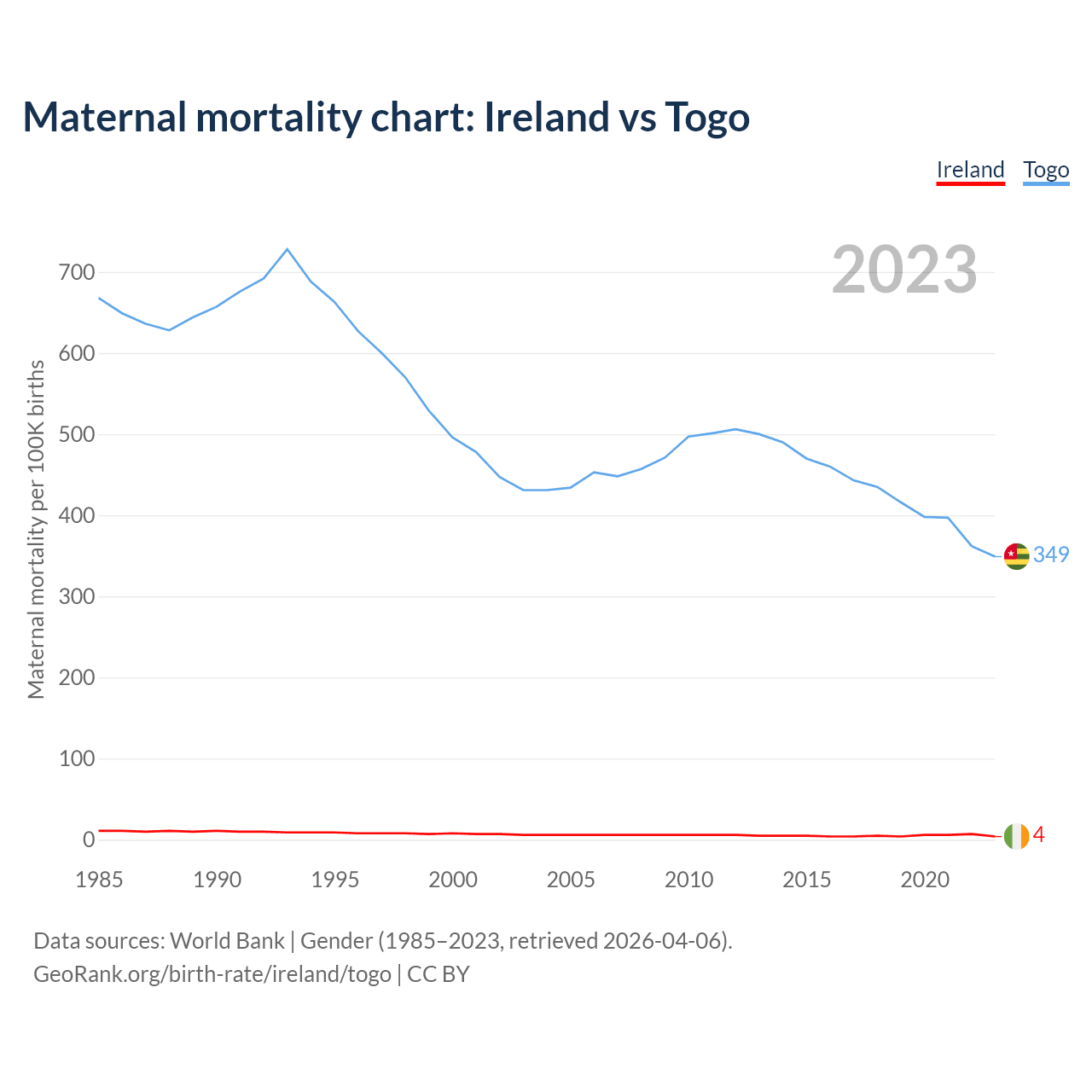 The maternal mortality rate, which is the probability of dying during childbirth or within 42 days of pregnancy termination, is 4 deaths per 100,000 live births in Ireland, compared to 349 deaths in Togo.