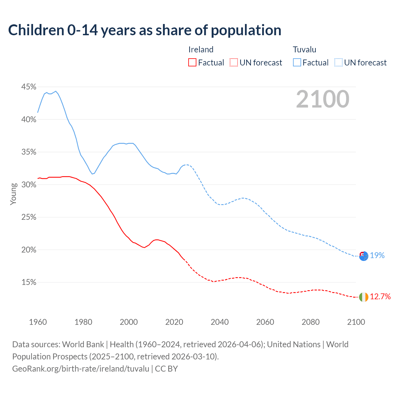 Ireland has an annual birth rate of 10.3 births per 1,000 people, compared to 23.1 for Tuvalu. The average number of children a woman is expected to have during her lifetime — the fertility rate, is 1.5 in Ireland and 3.21 in Tuvalu — 113.9% difference.