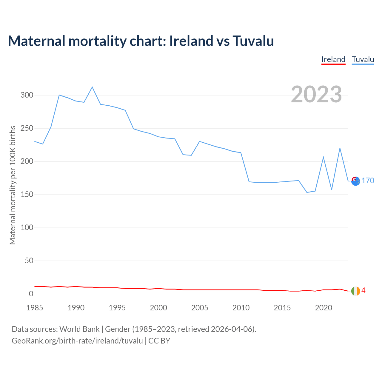 The maternal mortality rate, which is the probability of dying during childbirth or within 42 days of pregnancy termination, is 4 deaths per 100,000 live births in Ireland, compared to 170 deaths in Tuvalu.