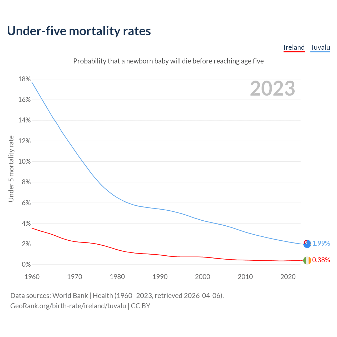 The chance that a newborn baby will die before reaching age five is 0.38% in Ireland and 1.99% in Tuvalu. Above is a chart with historical data on under-five mortality rates.
