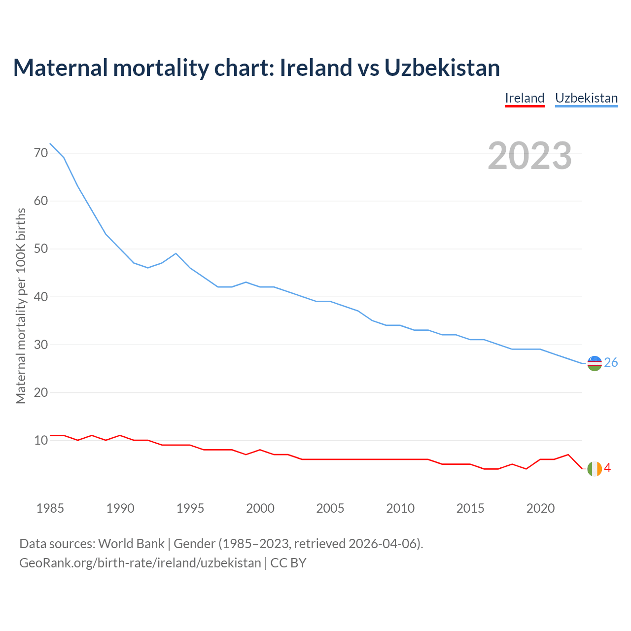 The maternal mortality rate, which is the probability of dying during childbirth or within 42 days of pregnancy termination, is 4 deaths per 100,000 live births in Ireland, compared to 26 deaths in Uzbekistan.