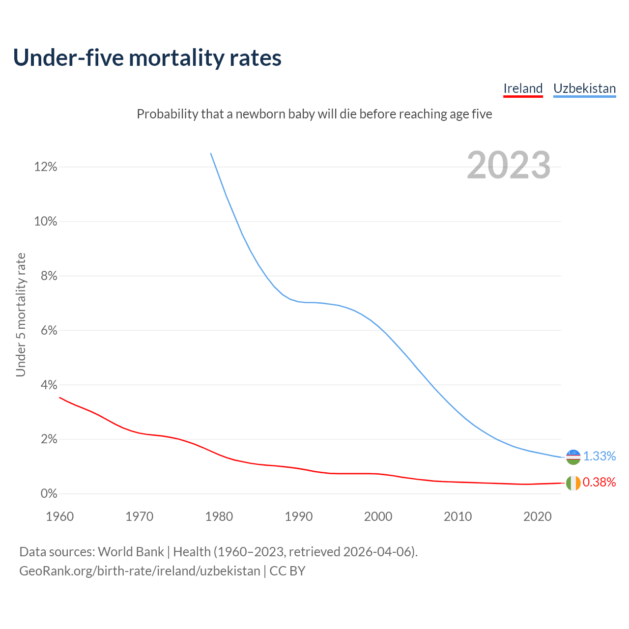 The chance that a newborn baby will die before reaching age five is 0.38% in Ireland and 1.33% in Uzbekistan. Above is a chart with historical data on under-five mortality rates.