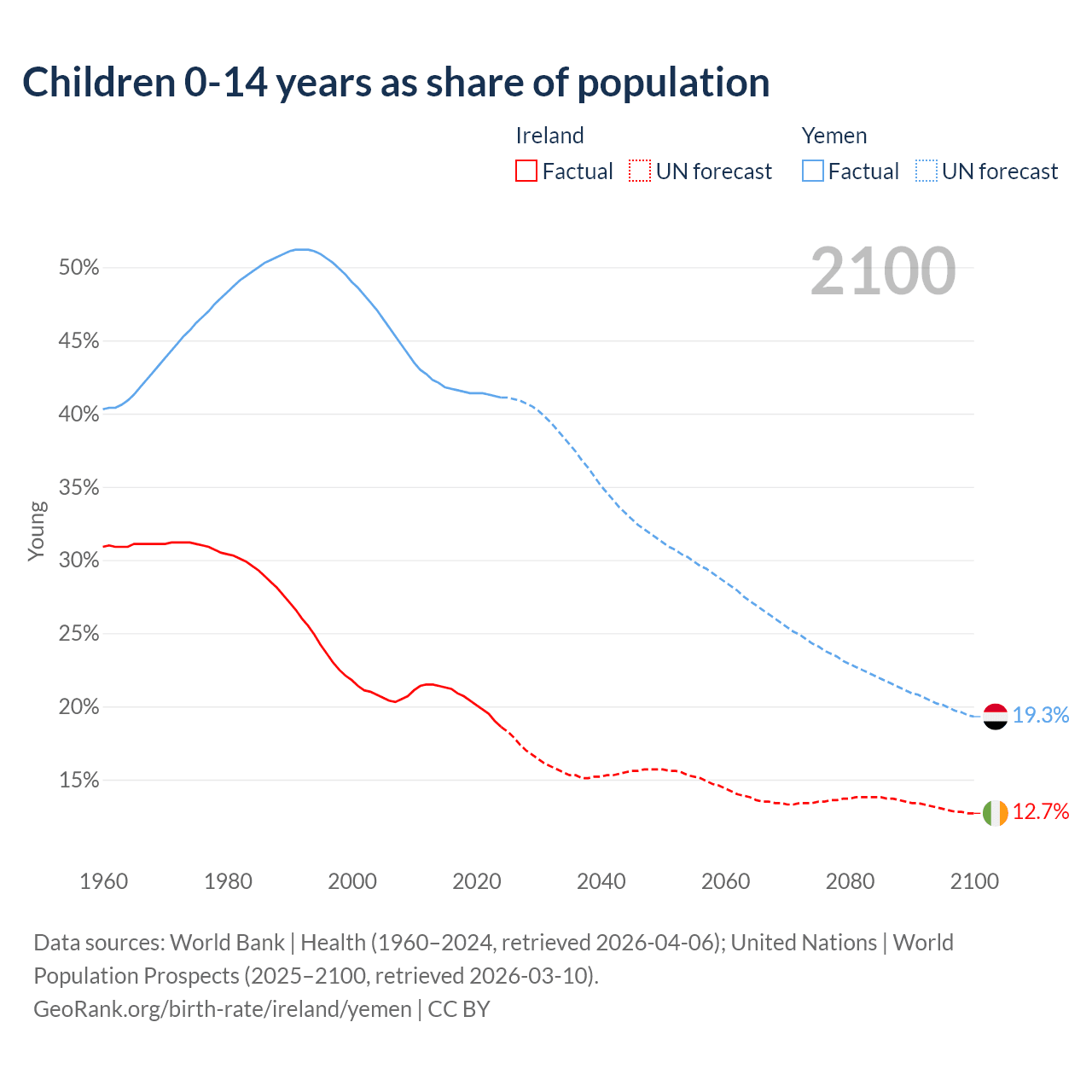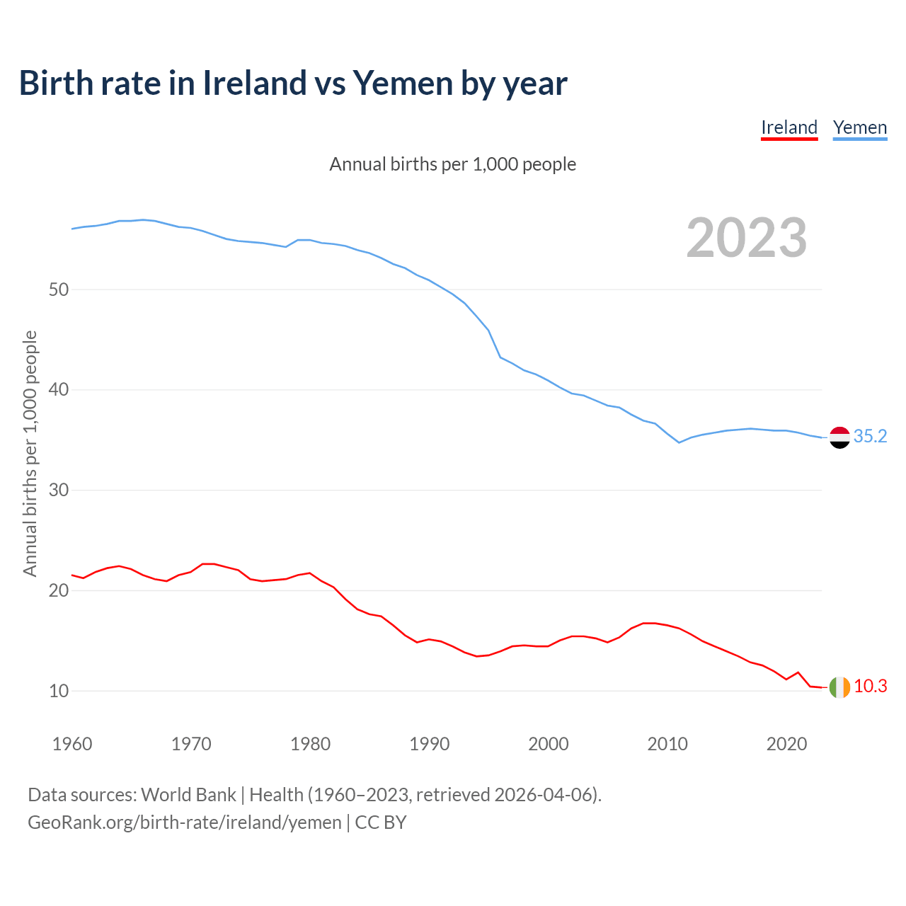 Ireland has an annual birth rate of 10.3 births per 1,000 people, compared to 35.2 for Yemen. The average number of children a woman is expected to have during her lifetime — the fertility rate, is 1.5 in Ireland and 4.59 in Yemen — 206% difference.