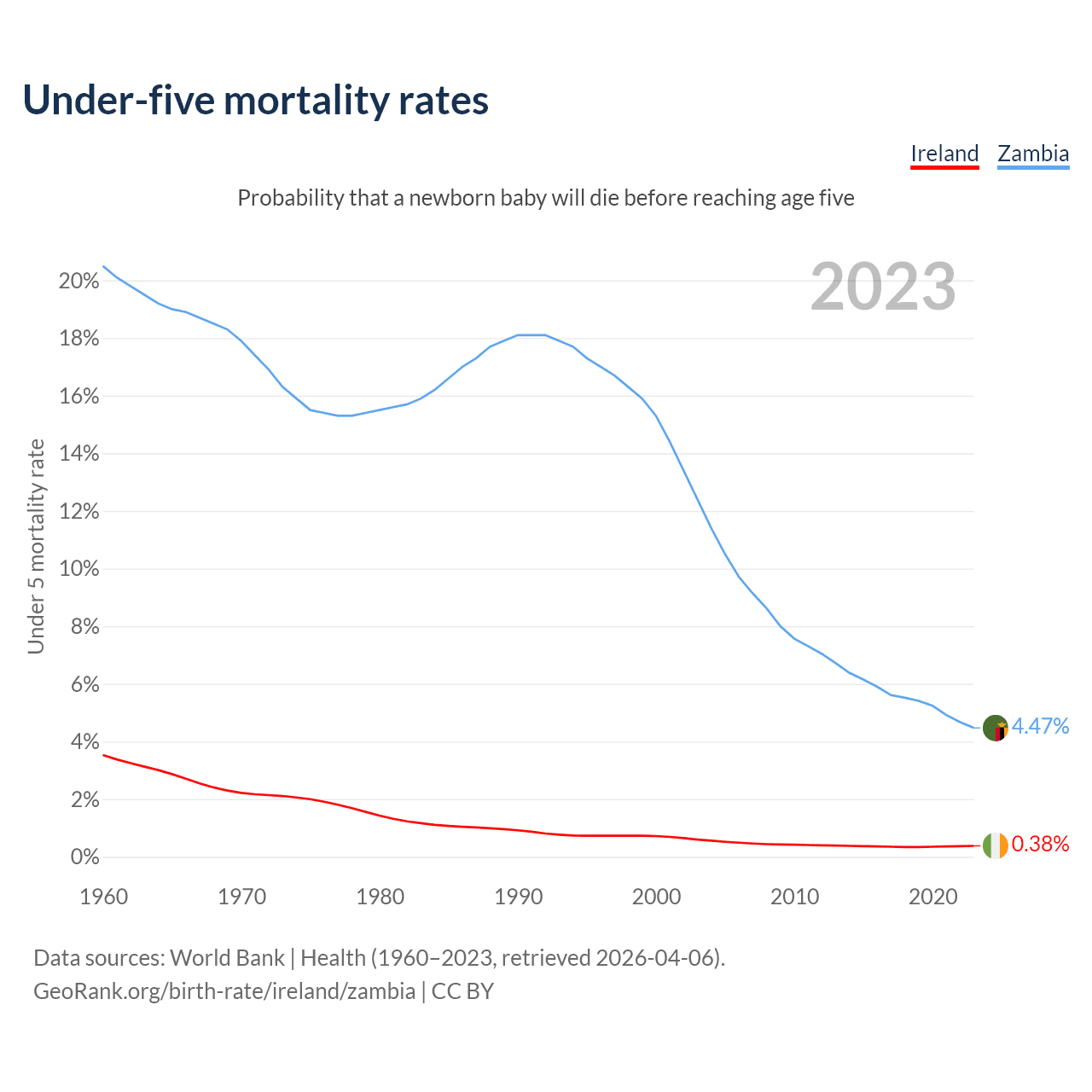 The chance that a newborn baby will die before reaching age five is 0.38% in Ireland and 4.47% in Zambia. Above is a chart with historical data on under-five mortality rates.
