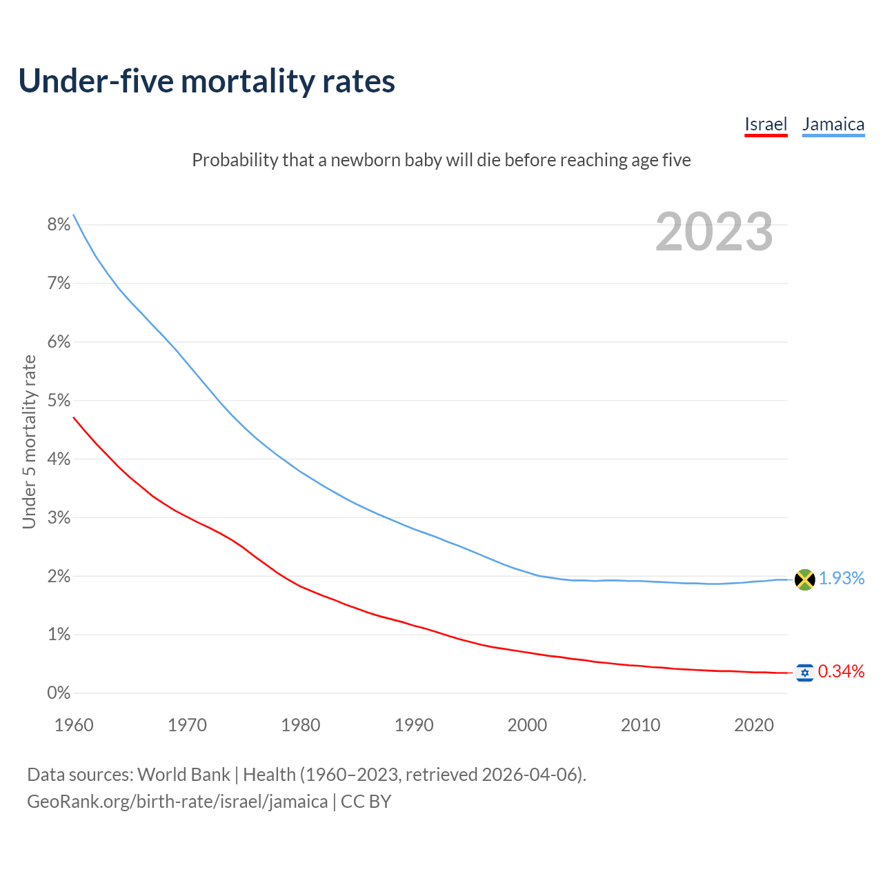 The chance that a newborn baby will die before reaching age five is 0.34% in Israel and 1.93% in Jamaica. Above is a chart with historical data on under-five mortality rates.