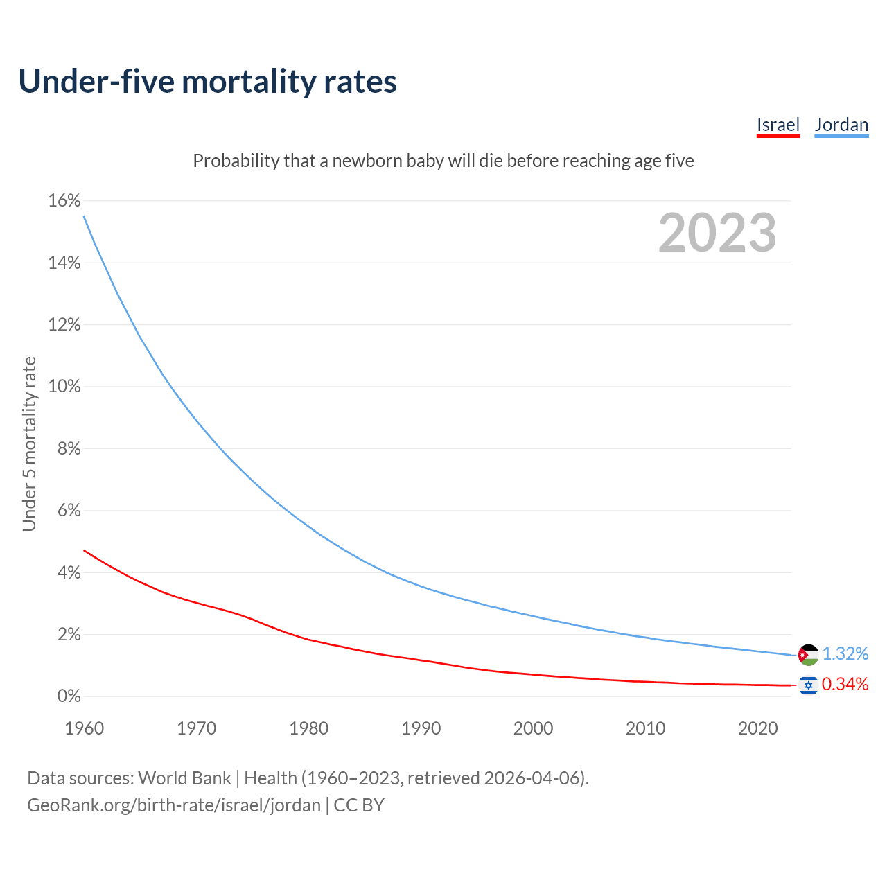 The chance that a newborn baby will die before reaching age five is 0.34% in Israel and 1.32% in Jordan. Above is a chart with historical data on under-five mortality rates.