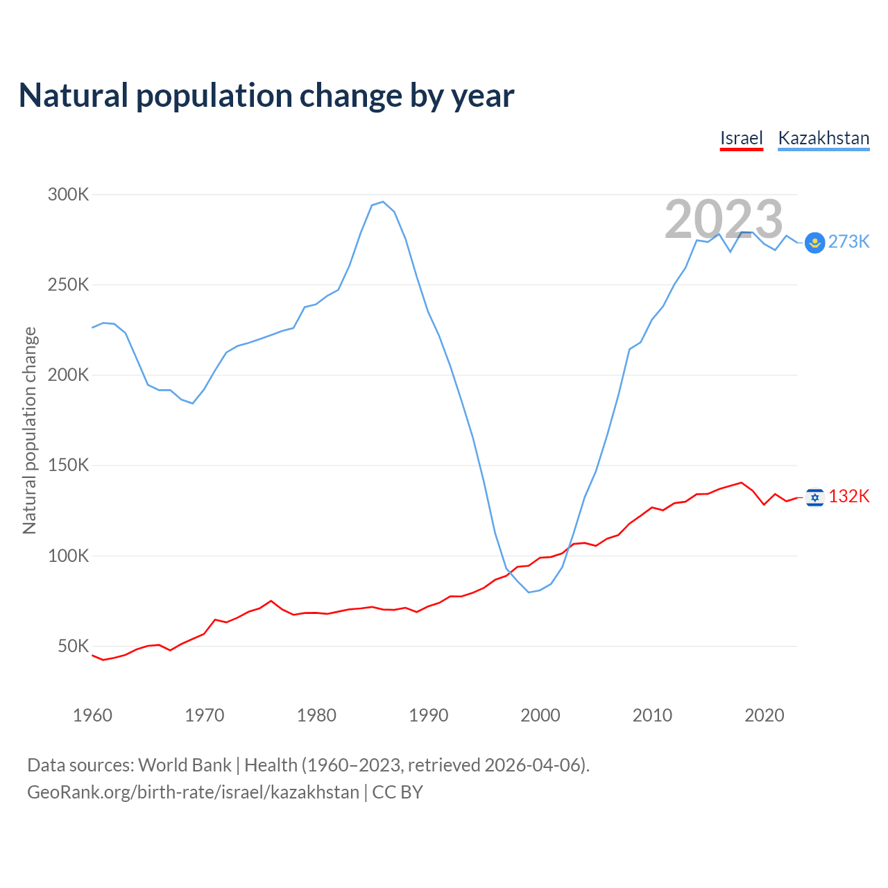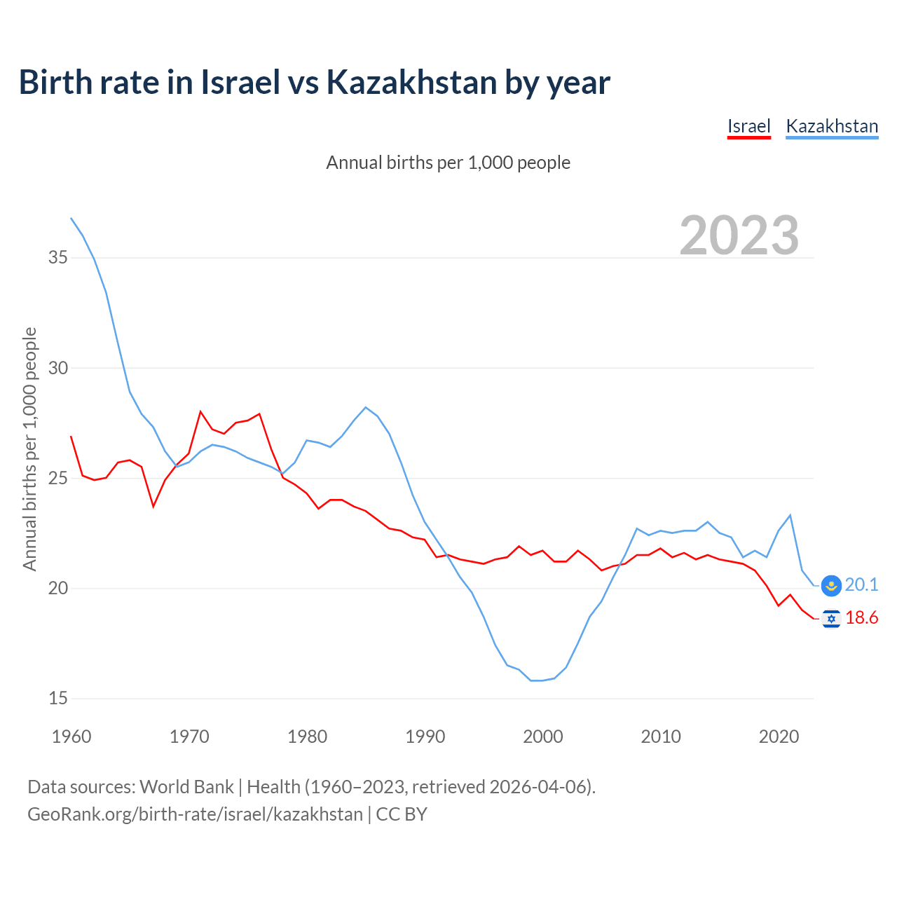 Israel has an annual birth rate of 18.6 births per 1,000 people, compared to 20.1 for Kazakhstan. The average number of children a woman is expected to have during her lifetime — the fertility rate, is 2.85 in Israel and 3.01 in Kazakhstan — 5.68% difference.