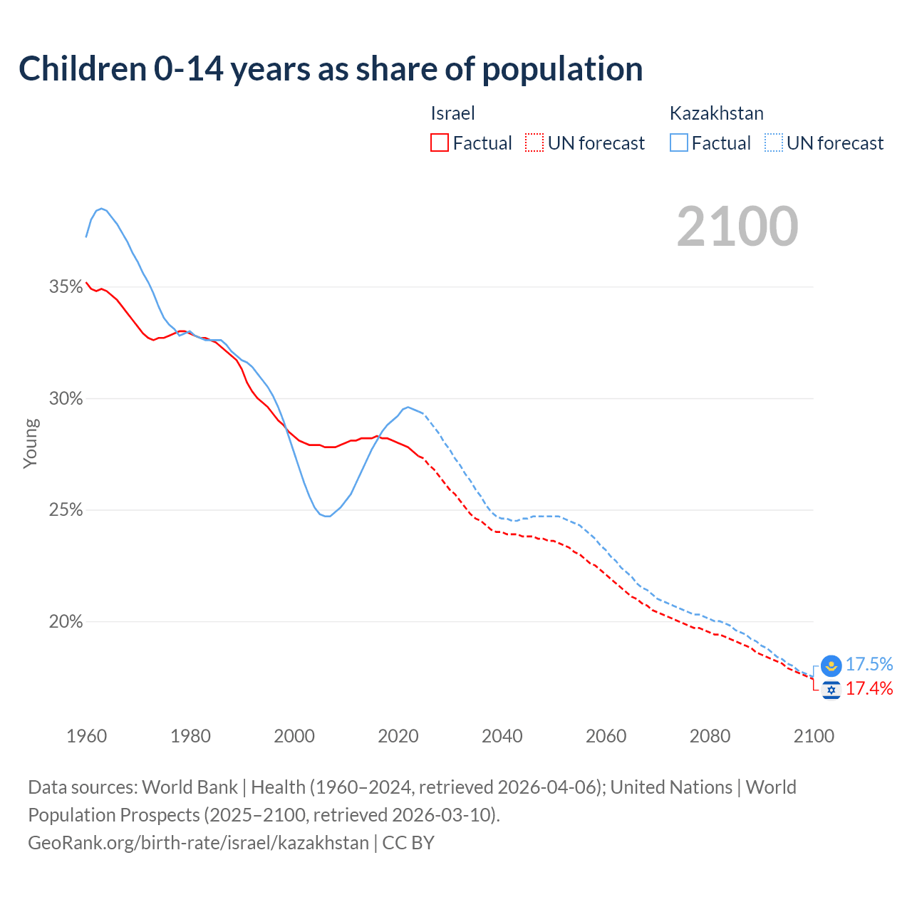 1960 vs 2023, the fertility rate has decreased by 26.3% in Israel and by 33% in Kazakhstan — in 1960, it was 3.87 and 4.5, respectively.