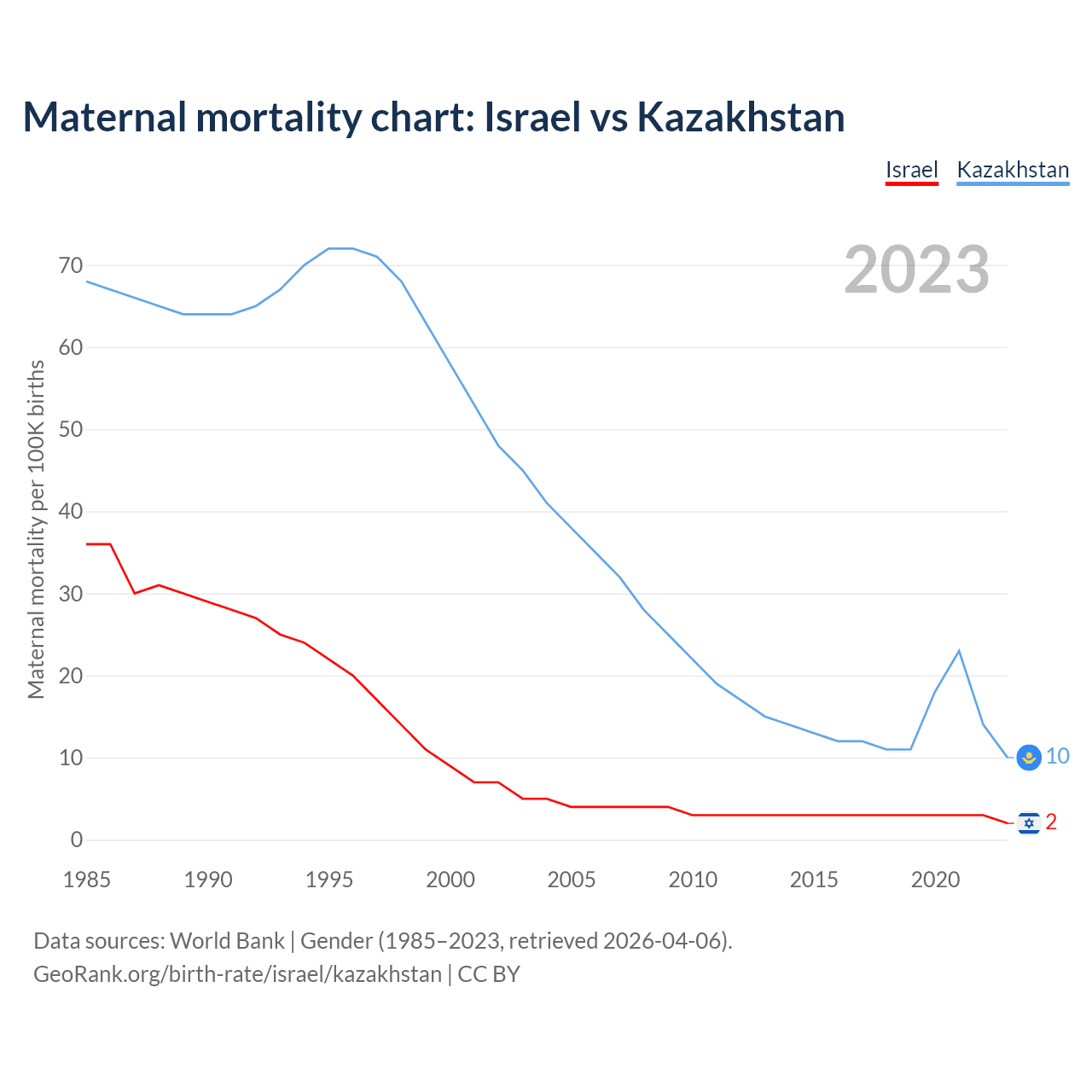 The maternal mortality rate, which is the probability of dying during childbirth or within 42 days of pregnancy termination, is 2 deaths per 100,000 live births in Israel, compared to 10 deaths in Kazakhstan.